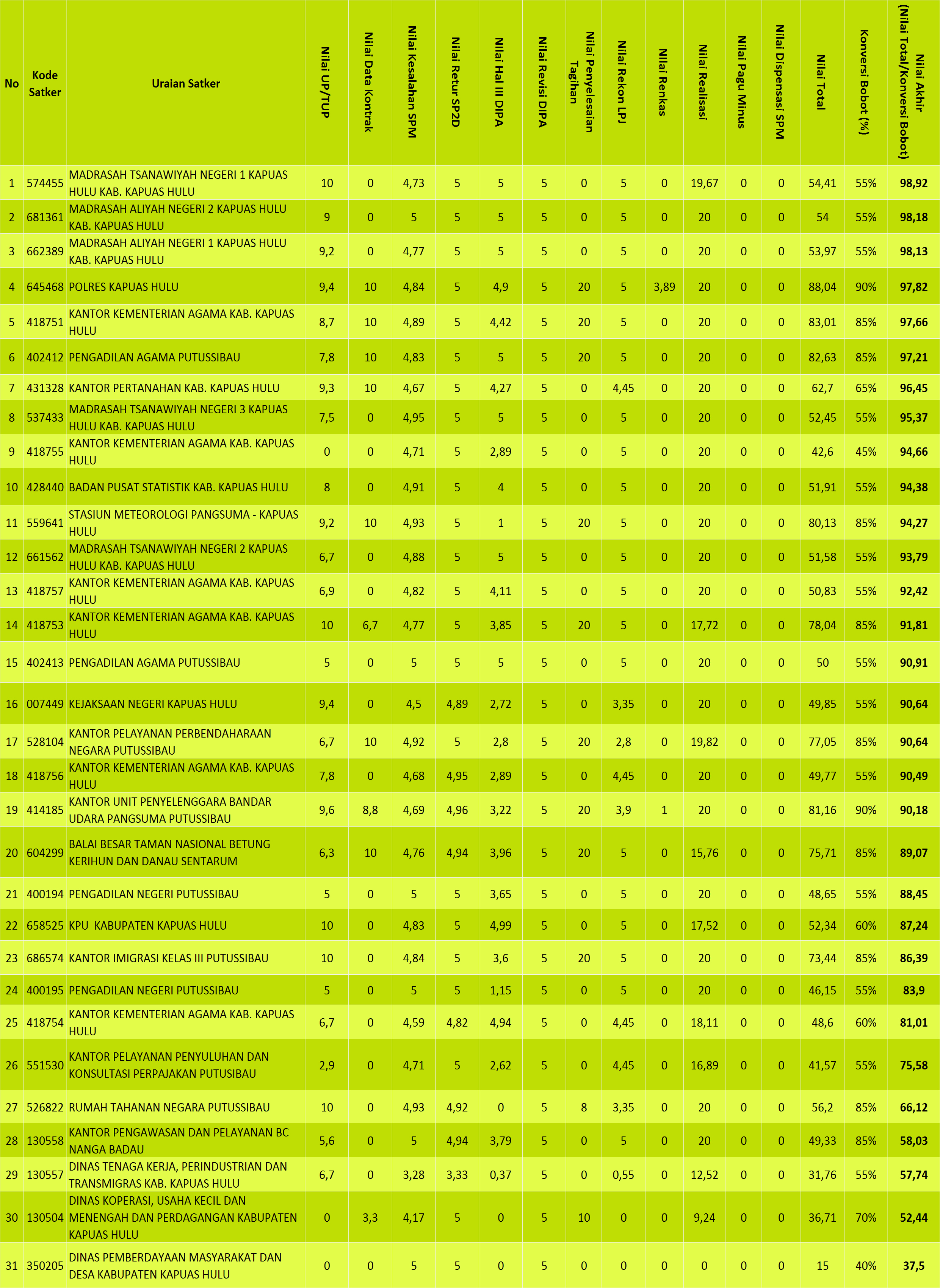Berikut adalah Indikator Kinerja Pelaksanaan Anggaran sampai dengan triwulan III Tahun 2018 untuk satuan kerja lingkup KPPN Putussibau. Data yang disajikan adalah data IKPA sd bulan September 2018 per tanggal 23 Oktober 2018.