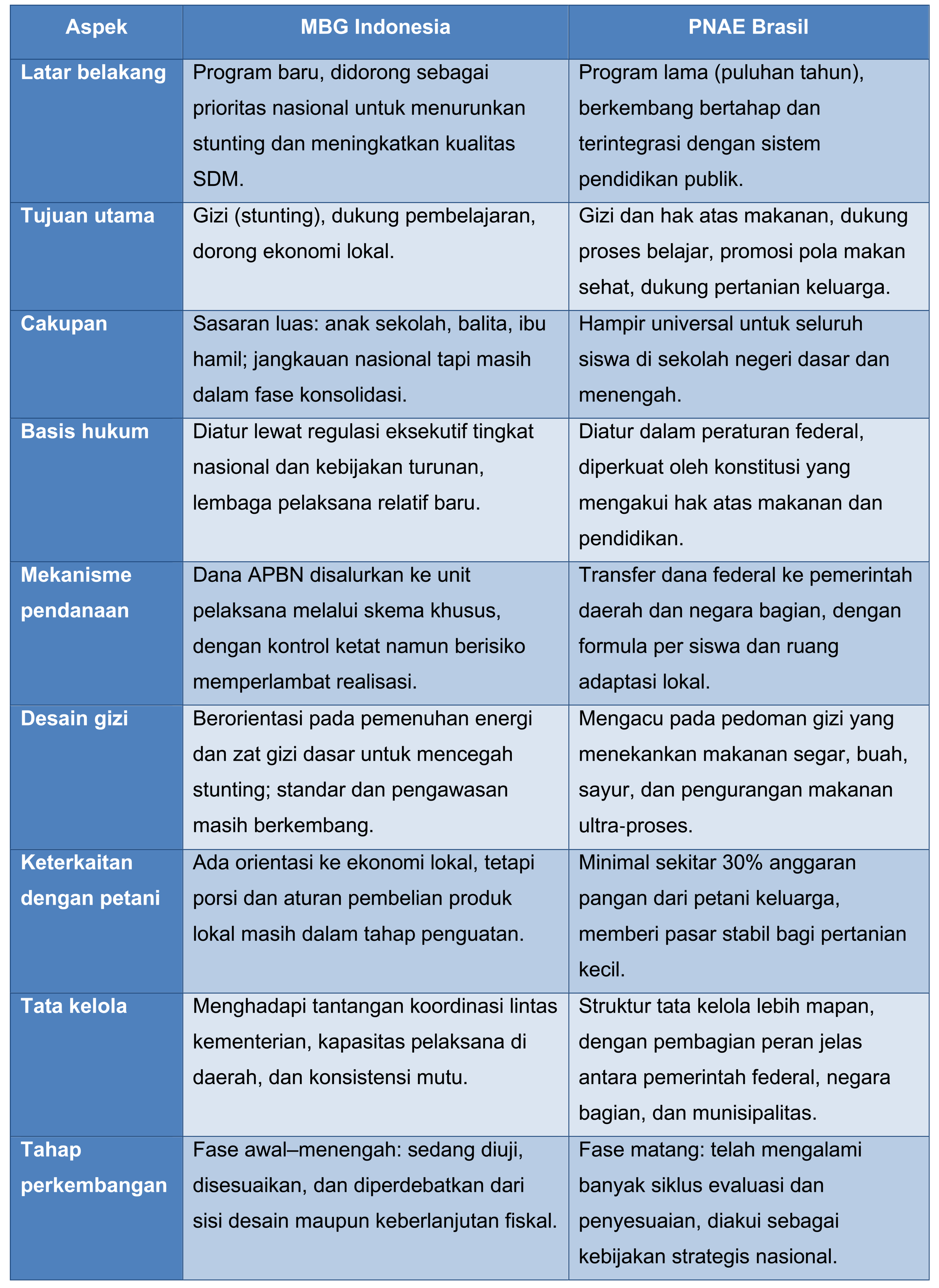 Tabel berikut merangkum beberapa aspek kunci perbandingan antara MBG Indonesia dan PNAE Brasil.