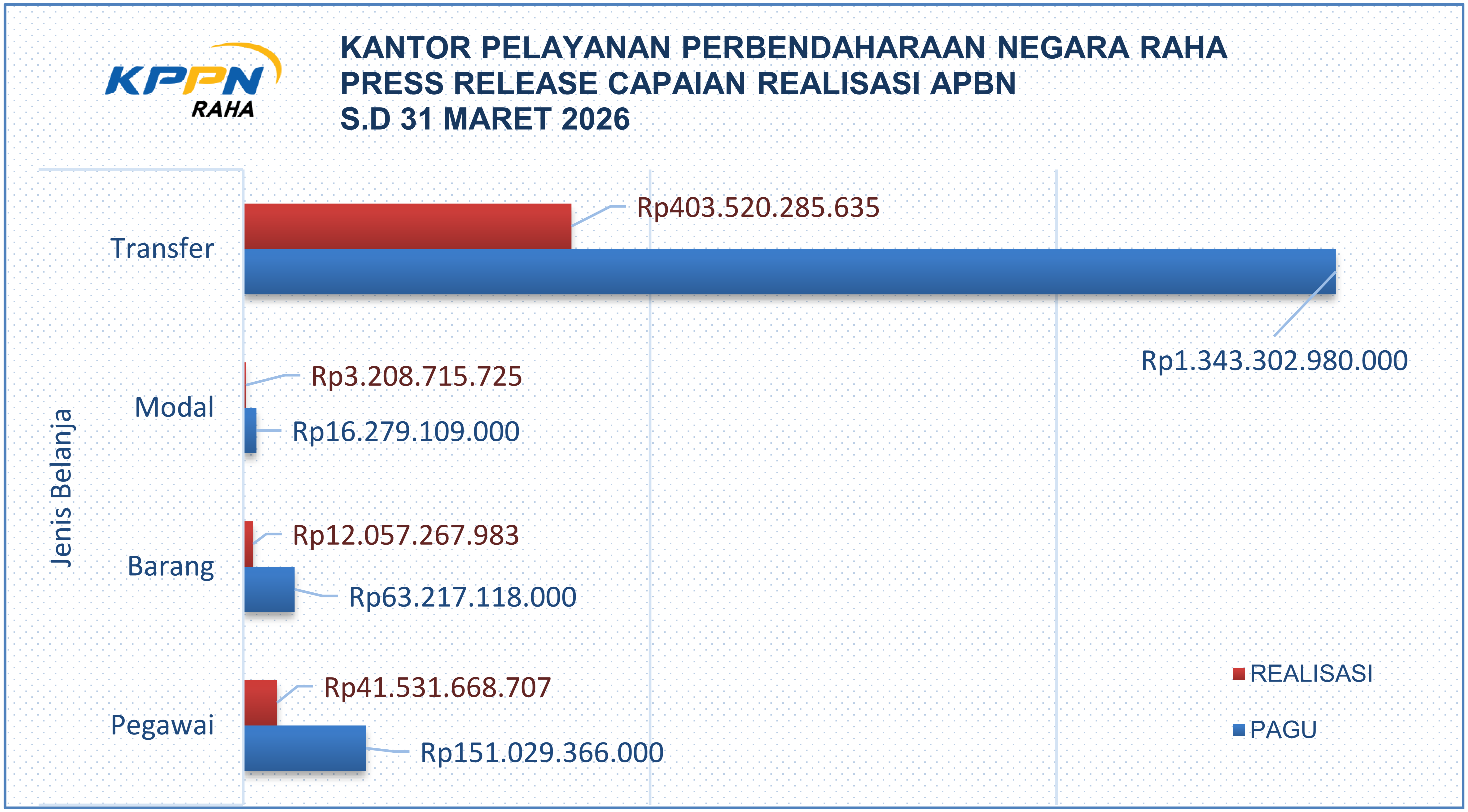 Sampai dengan bulan Maret 2026, KPPN Raha telah menyalurkan sebesar 29,25% atau sebesar Rp460.317.938.050,- dana APBN dari total pagu Rp1.573.828.573.000,- dengan jenis Belanja yang terdiri dari Belanja Pegawai, Belanja Barang, Belanja Modal, dan Belanja Transfer. Berikut gambaran rincian realisasi APBN per jenis belanja :