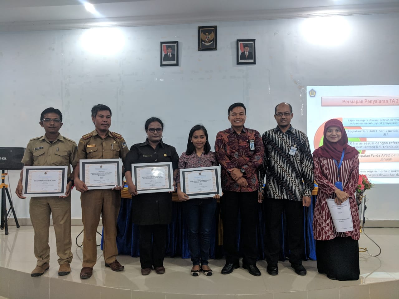 Paparan berakhir dilanjutkan dengan pemberian Apresiasi kepada Pemda terbaik dalam pengelolaan DAK Fisik (BPKAD) dan Dana Desa (BPMD) serta OPD terbaik dalam pengelolaan DAK Fisik per Bidang, Apresiasi diberikan kepada :