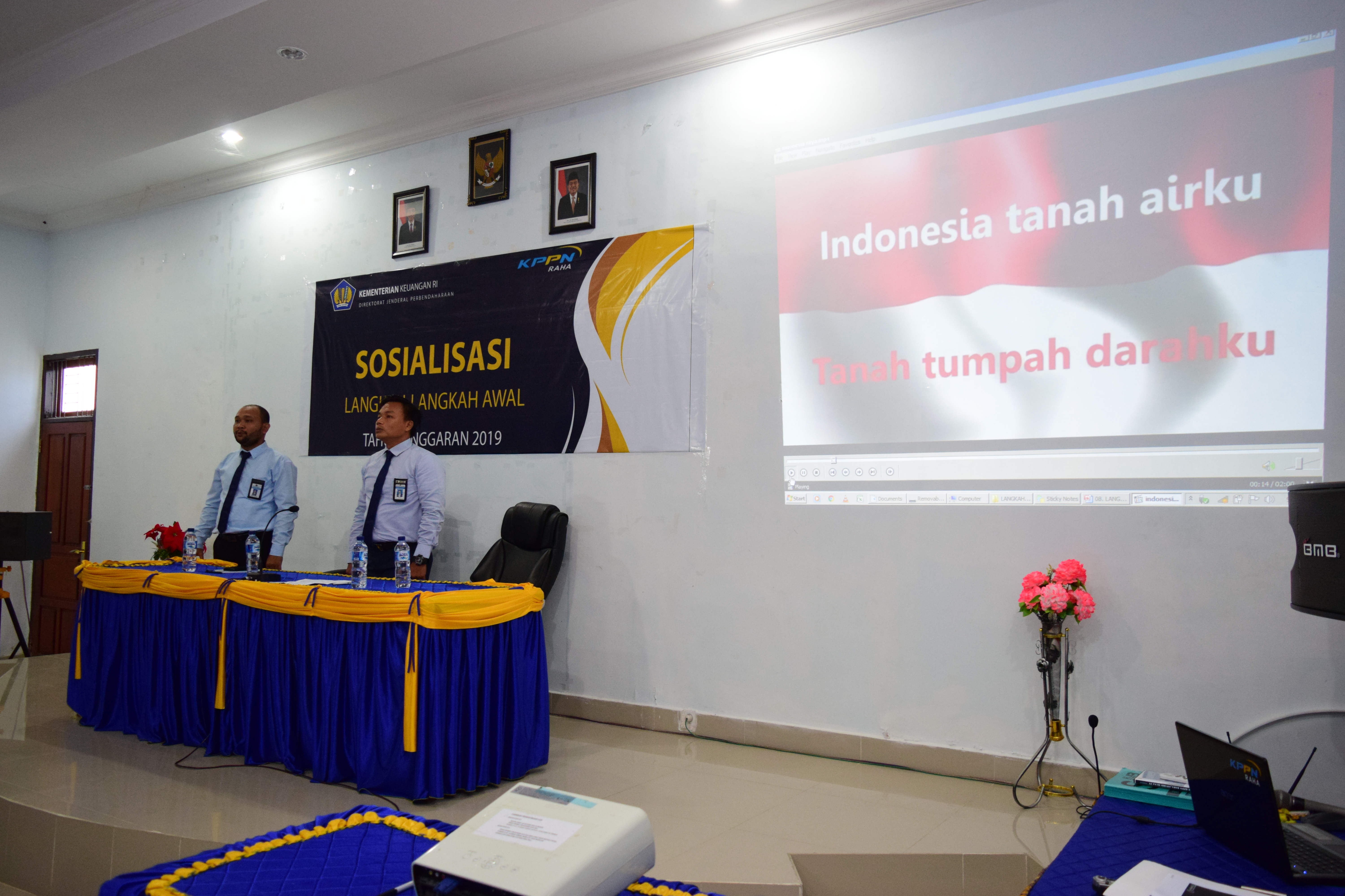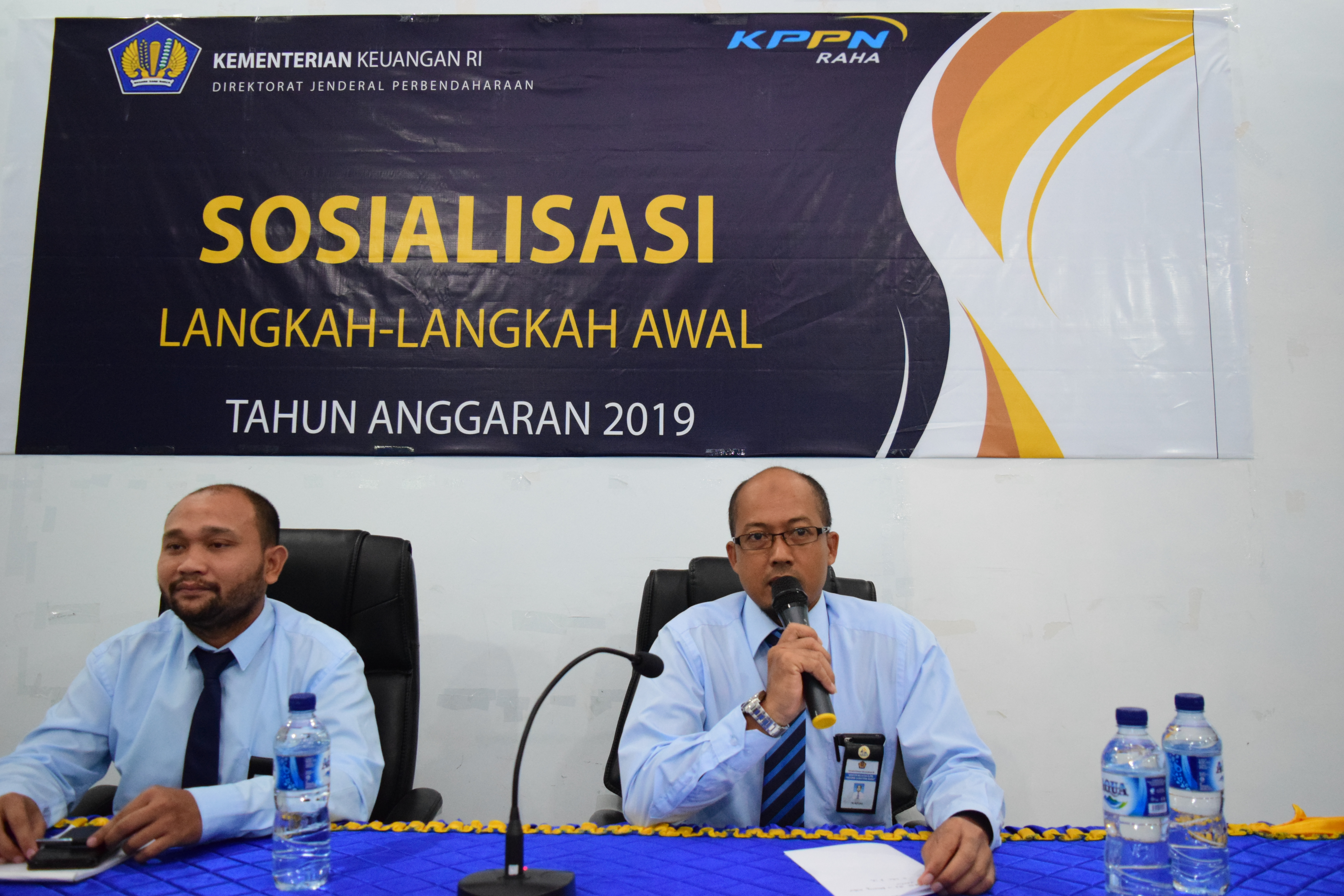 KPPN Raha menyelenggarakan Sosialisasi Langkah-Langkah Awal Tahun 2019 pada hari selasa, tanggal 23 Januari 2019 lalu, di Ruang Aula KPPN Raha, yang dihadiri oleh Satuan Kerja mitra KPPN Raha para bendahara dan PPSM. Kepala KPPN Raha membuka sosialisasi ini dengan menyampaikan Current Issue terkait perbandingan anggaran tahun 2018 dan 2019 serta penyaluran dana desa yang telah dilakukan melalui KPPN Raha pada tahun anggaran 2018.