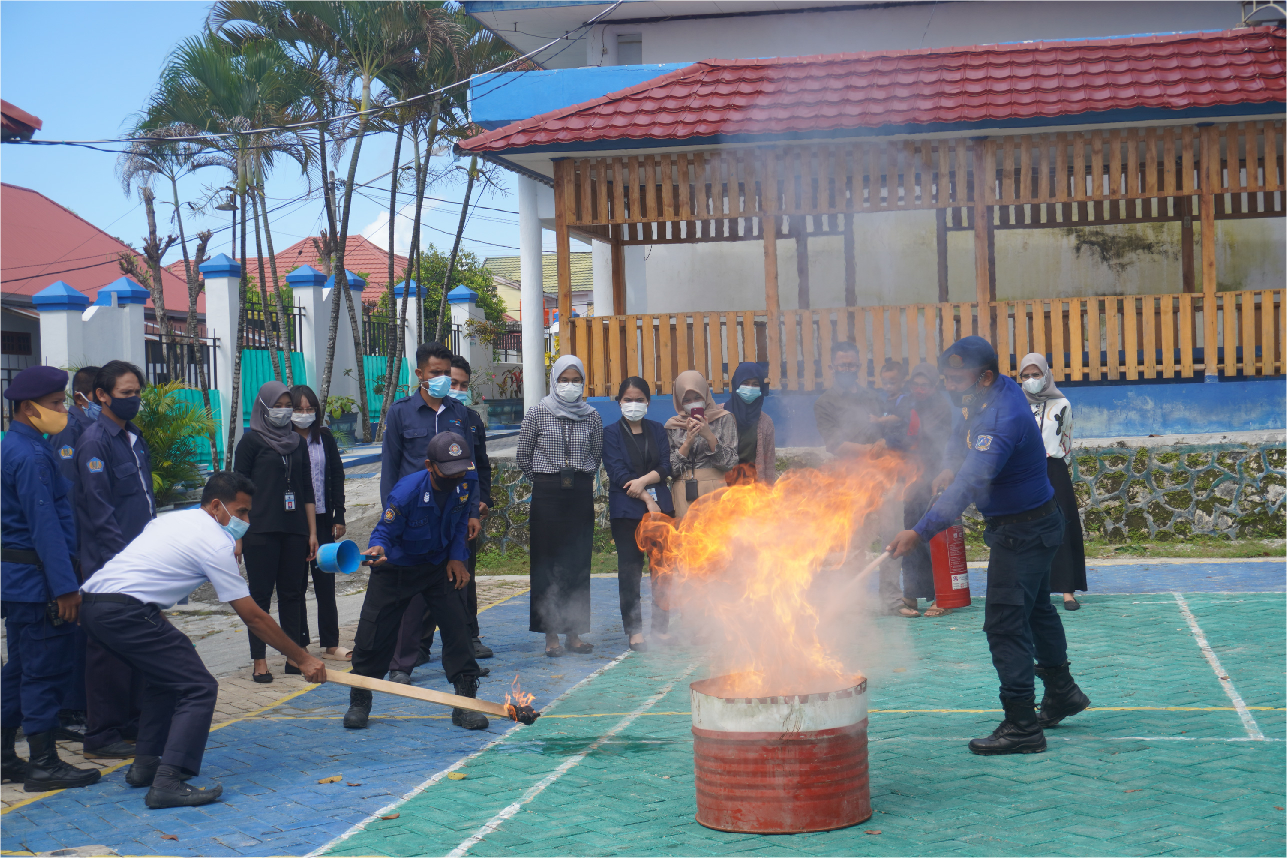 Praktik langsung dalam menanggulangi kebakaran kecil dilakukan di Lapangan Voly KPPN Raha setelah dipraktikan oleh Damkar Muna. Seluruh satpam dan supir mempraktikan penanggulangan kebakaran kecil ini.