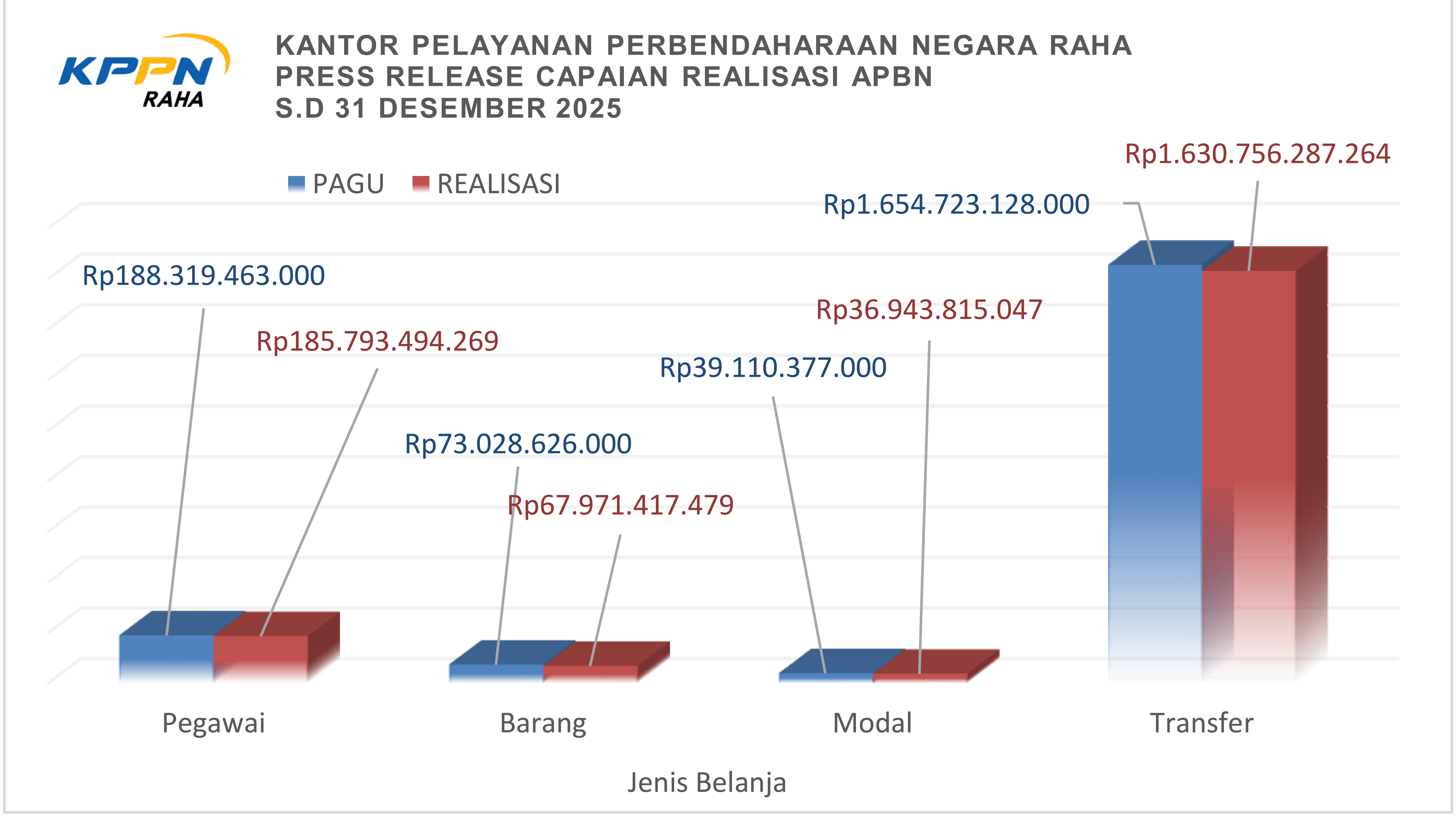 Sampai dengan bulan Desember 2025, KPPN Raha telah menyalurkan sebesar 98,28% atau sebesar Rp1.921.465.014.059,- dana APBN dari total pagu Rp1.955.181.594.000,- dengan jenis Belanja yang terdiri dari Belanja Pegawai, Belanja Barang, Belanja Modal, dan Belanja Transfer. Berikut gambaran rincian realisasi APBN per jenis belanja :