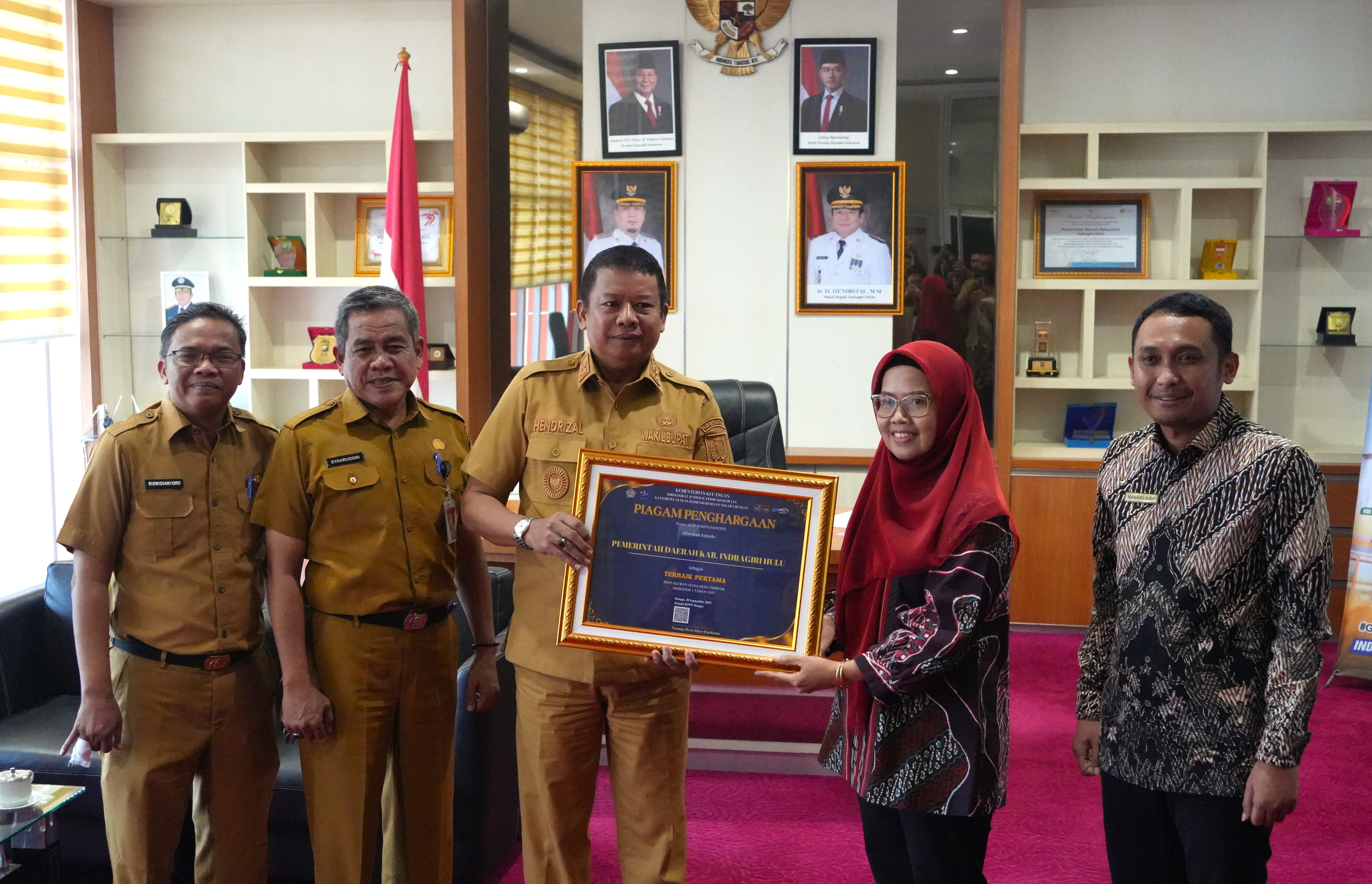 Kepala Kanwil DJPb Riau didampingi Kepala KPPN Rengat menyampaikan apresiasi atas pencapaian Pemda Kabupaten Indragiri Hulu yang berhasil meraih penghargaan terbaik pertama kategori penyaluran dana desa terbaik pada acara Treasury Awards Semester I Tahun 2025 yang diselenggarakan oleh KPPN Rengat. Apresiasi juga diberikan atas keberhasilan pemerintah daerah kabupaten Indragiri hulu meraih opini WTP dalam laporan keuangan daerah.