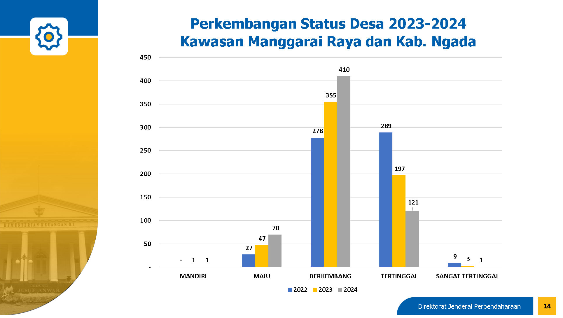 Indikator lain yang digunakan untuk mengukur efektivitas dana desa adalah dengan menggunakan data Indeks Desa Membangun (IDM) yang digunakan Pemerintah untuk menetapkan status desa, yakni Mandiri, Maju, Berkembang, Tertinggal, dan Sangat Tertinggal. Dilihat dari progressnya, status desa di wilayah Manggarai Raya dan Kabupaten Ngada mengalami perkembangan yang cukup pesat. Berdasarkan data pada Online Monitoring Sistem Perbendaharaan dan Anggaran Negara (OM-SPAN), desa maju pada tahun 2023 mengalami pertumbuhan positif sebesar 74,07% dan tahun tahun 2024 tumbuh 48,94%. Demikian pula dengan desa berkembang yang juga tumbuh 27,69% di tahun 2023 dan pada tahun 2024 tumbuh sebesar 15,49%.
