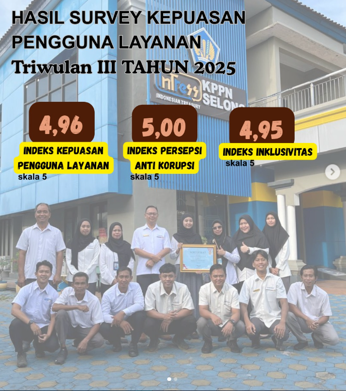 KPPN Selong menyampaikan terima kasih dan apresiasi kepada seluruh Satuan Kerja dan pemangku kepentingan atas partisipasi dalam pelaksanaan Survey Kepuasan Pengguna Layanan, Survey Persepsi Anti Korupsi, dan Survey Inklusivitas Triwulan III Tahun 2025.