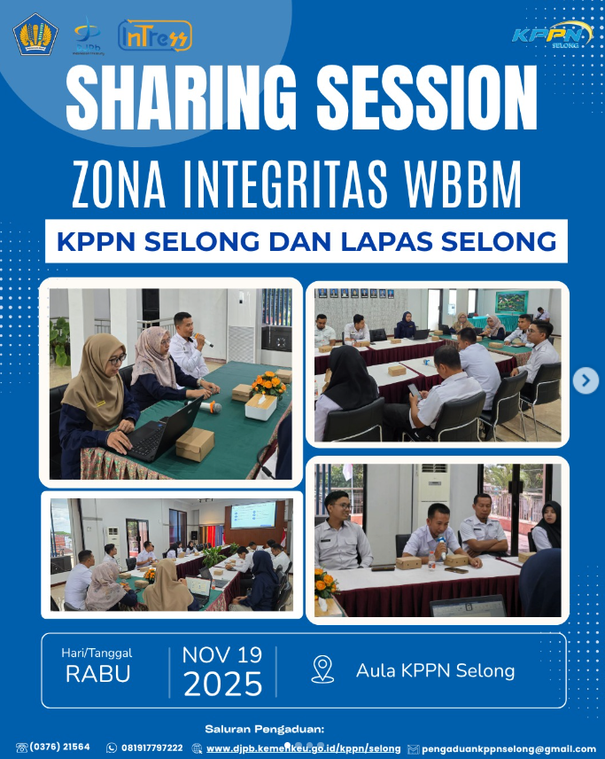 Rabu, 19 November 2025, telah dilaksanakan Sharing Session Zona Integritas menuju WBBM antara KPPN Selong dan Lapas Kelas II B Selong. Kegiatan ini menjadi wadah untuk berbagi pengalaman, strategi, dan komitmen dalam mewujudkan pelayanan publik yang bersih, transparan, dan bebas dari korupsi. Bersama kita wujudkan reformasi birokrasi yang berkelanjutan!