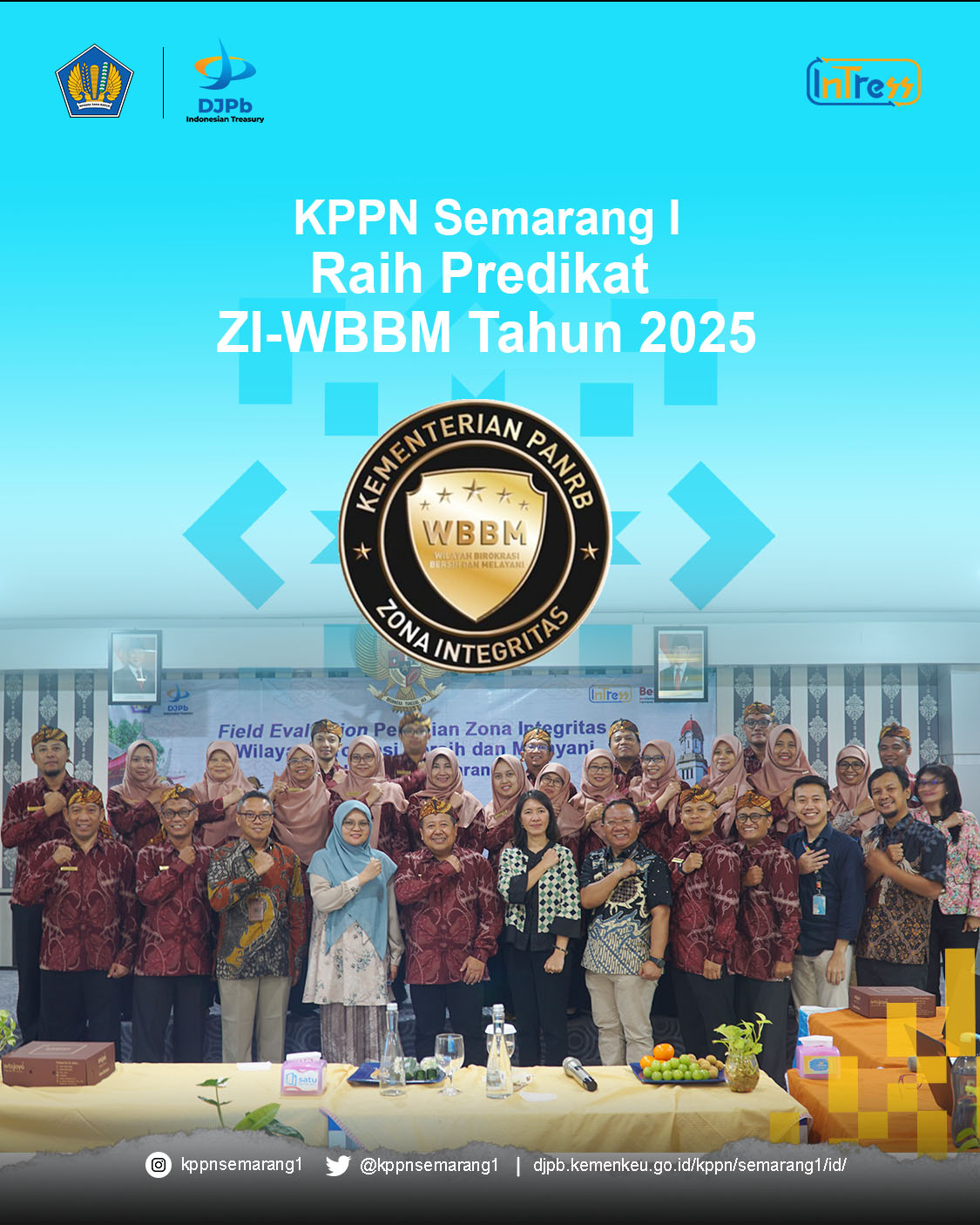KPPN Semarang I berhasil meraih Predikat Zona Integritas – Wilayah Birokrasi Bersih dan Melayani (ZI-WBBM) Tahun 2025 yang disampaikan dalam kegiatan SAKIP dan ZI Awards 2025 oleh Kementerian PANRB pada 11 Februari 2026. Raihan ini merupakan prestasi bersama yang terwujud melalui kolaborasi, komitmen, dan dukungan seluruh mitra kerja serta pemangku kepentingan.