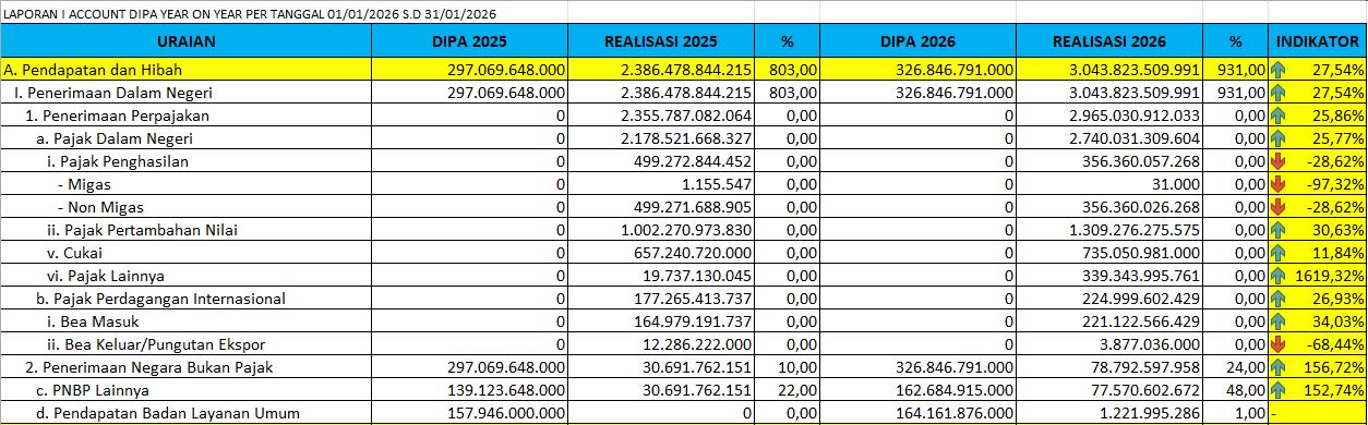 Hingga 31 Januari 2026, realisasi APBN lingkup KPPN Semarang I telah mencapai Rp2,13 T atau 11% dari total pagu Rp19,34 T. Capaian ini mencerminkan komitmen bersama dalam menjaga akselerasi belanja negara sejak awal tahun.