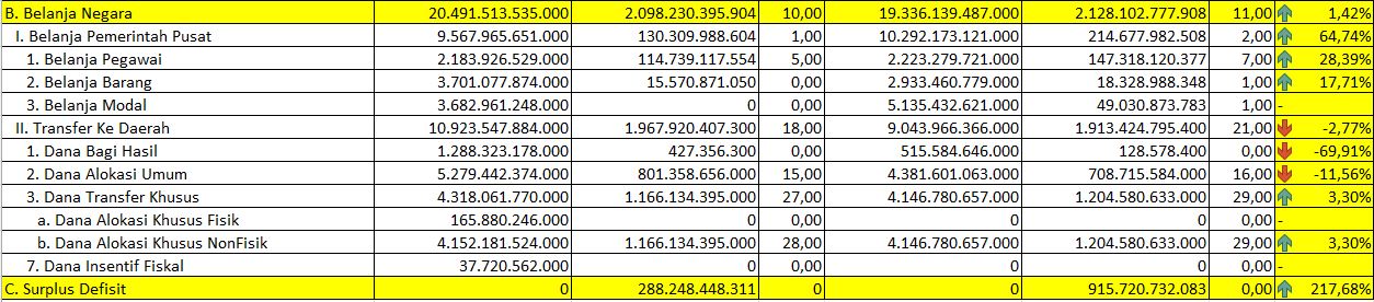 Dari sisi komposisi, Belanja Pemerintah Pusat (K/L) terealisasi sebesar Rp214 M, yang dimanfaatkan untuk mendukung operasional pemerintahan, pelaksanaan program, serta bantuan kepada masyarakat. Realisasi belanja Pemerintah Pusat tersebut terdiri dari belanja pegawai sebesar 147 M, belanja barang 18,3 M, dan belanja modal 49,1 M. Sementara itu, Transfer ke Daerah mencapai Rp1,91 T dari pagu Rp9,04 T, sebagai wujud dukungan APBN dalam memperkuat kapasitas fiskal dan pembangunan daerah.