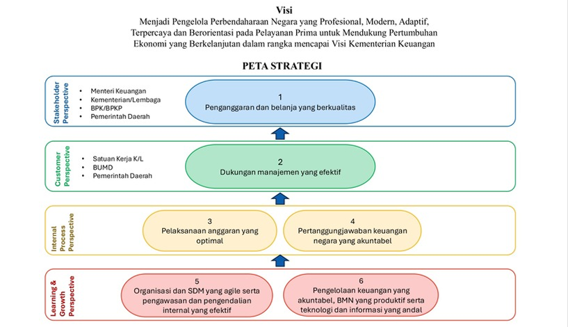 Peta Strategi merupakan suatu dashboard yang memetakan sasaran strategis (SS) dalam suatu kerangka hubungan sebab akibar yang menggambarkan keseluruhan perjalanan strategi organisasi dalam mewujudkan visi dan misi. Peta strategi di lingkungan Kementerian Keuangan secara umum menggunakan 4 (empat) perspektif, yaitu: