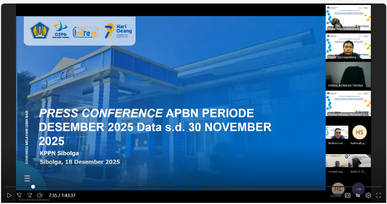 Kamis, 18 Desember 2025, KPPN Sibolga menyelenggarakan kegiatan Press Conference APBN periode Desember Tahun 2025 secara daring. Kegiatan ini merupakan kegiatan rutin bulanan yang diselenggarakan oleh KPPN Sibolga sebagai salah satu inovasi komunikasi publik untuk menyampaikan informasi kinerja APBN secara periodik.