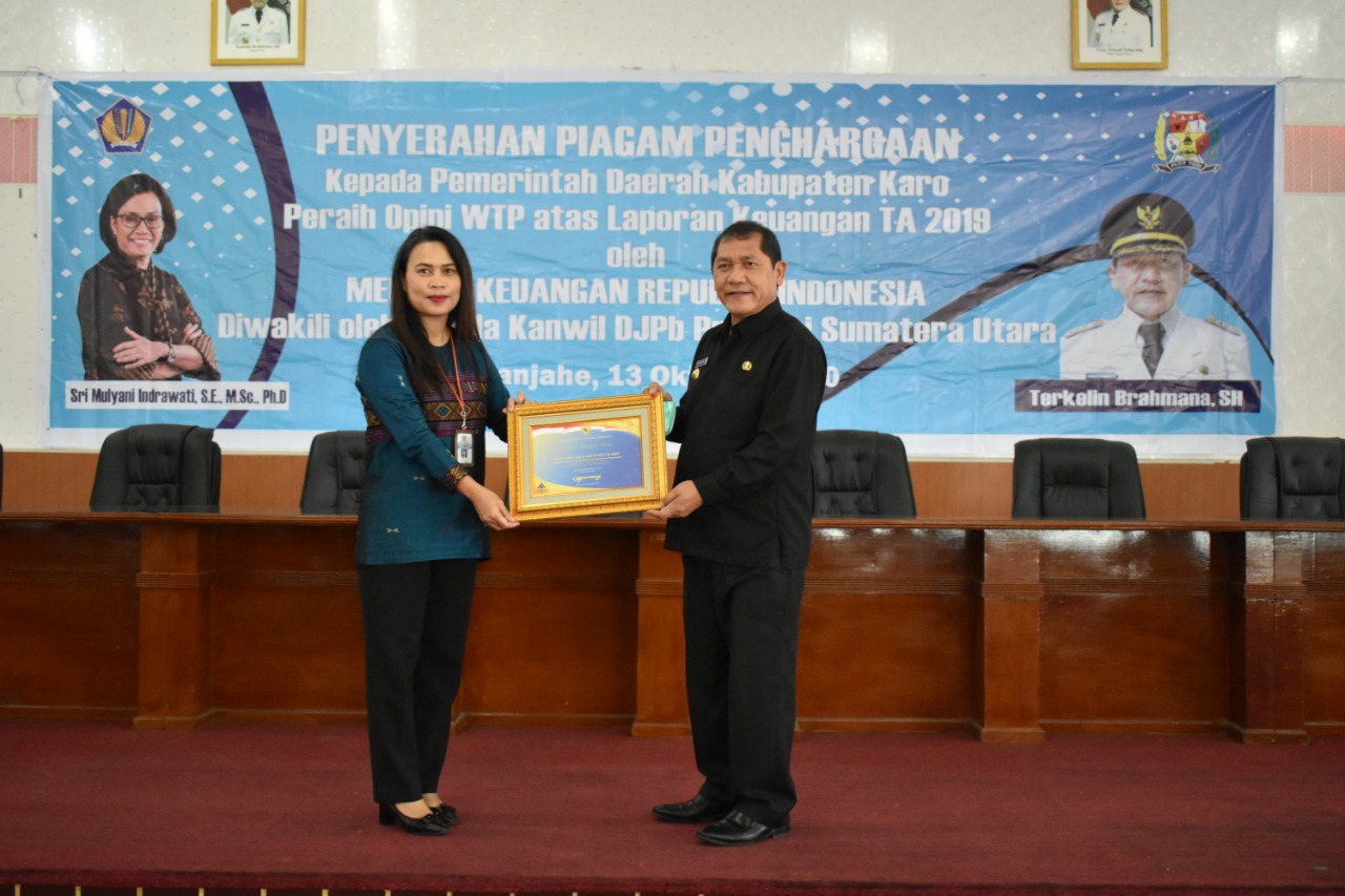 Bupati Karo, Terkelin Brahmana, SH menyebutkan Pemerintah Karo menyampaikan rasa bangga dan terima kasih yang sebesar-besarnya kepada Menteri Keuangan Republik Indonesia melalui Kanwil DJPb Provinsi Sumatera Utara atas piagam penghargaan yang telah diberikan kepada Pemerintah Kabupaten Karo dalam capaian opini WTP untuk tahun 2019.