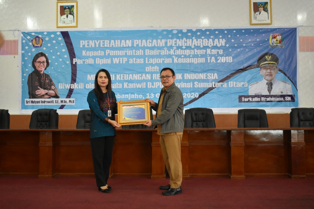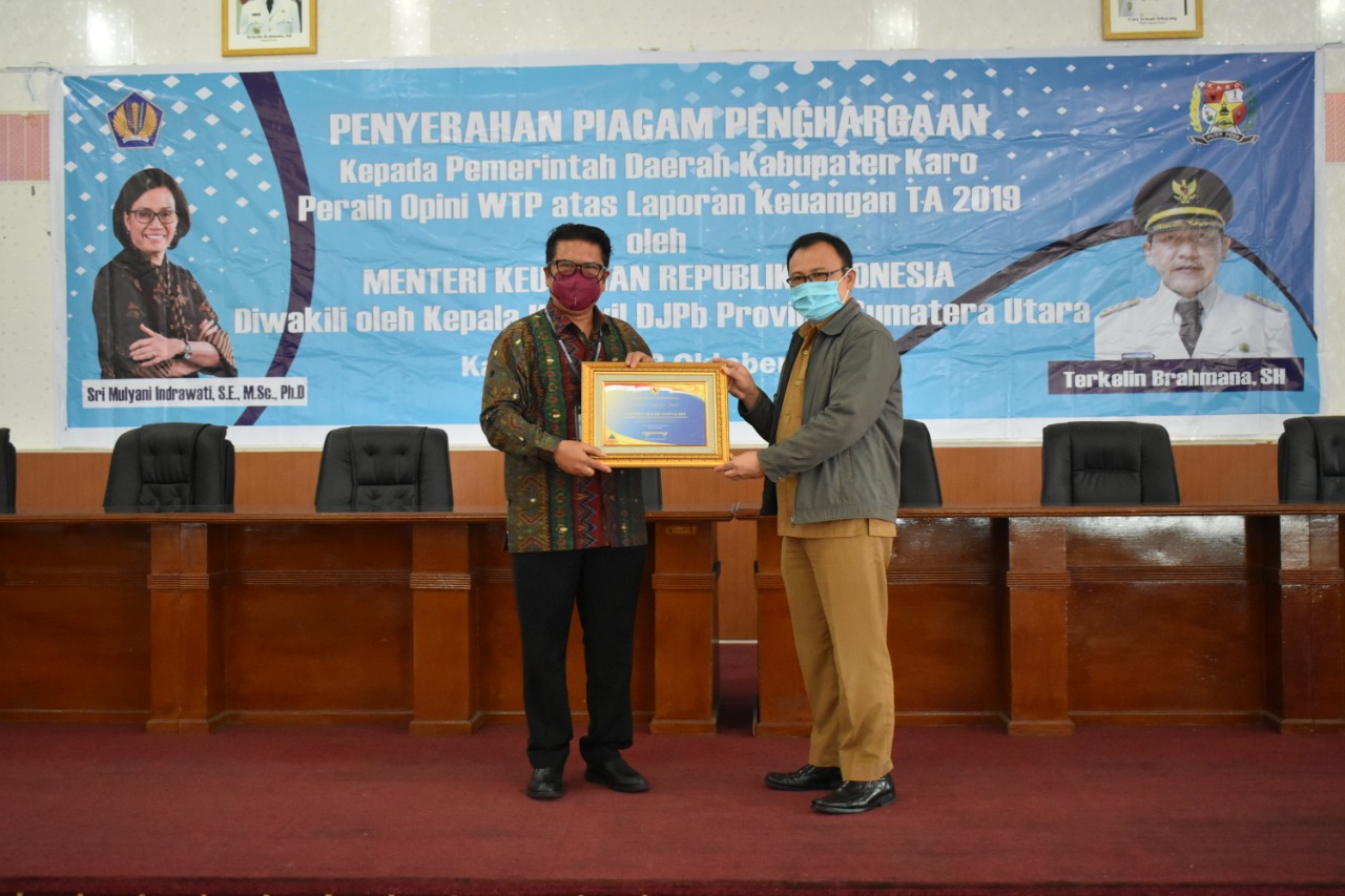 Kepala Kanwil DJPb Provinsi Sumatera Utara, Tiarta Sebayang Mewakili Menteri Keuangan memberikan Penghargaan ini kepada Bupati Karo Terkelin Brahmana, dalam rangka kunjungan kerja asistensi dan pembinaan anggaran daerah, di aula kantor bupati, Selasa (13/10/2020). Kepala Kanwil DJPb Sumut menyerahkan langsung penghargaan Opini WTP atas laporan keuangan TA 2019 kepada Bupati Karo. “Opini WTP yang dicapai, telah memenuhi syarat serta ketentuan sesuai hasil pemeriksaan dari BPK,” kata Tiarta Sebayang.