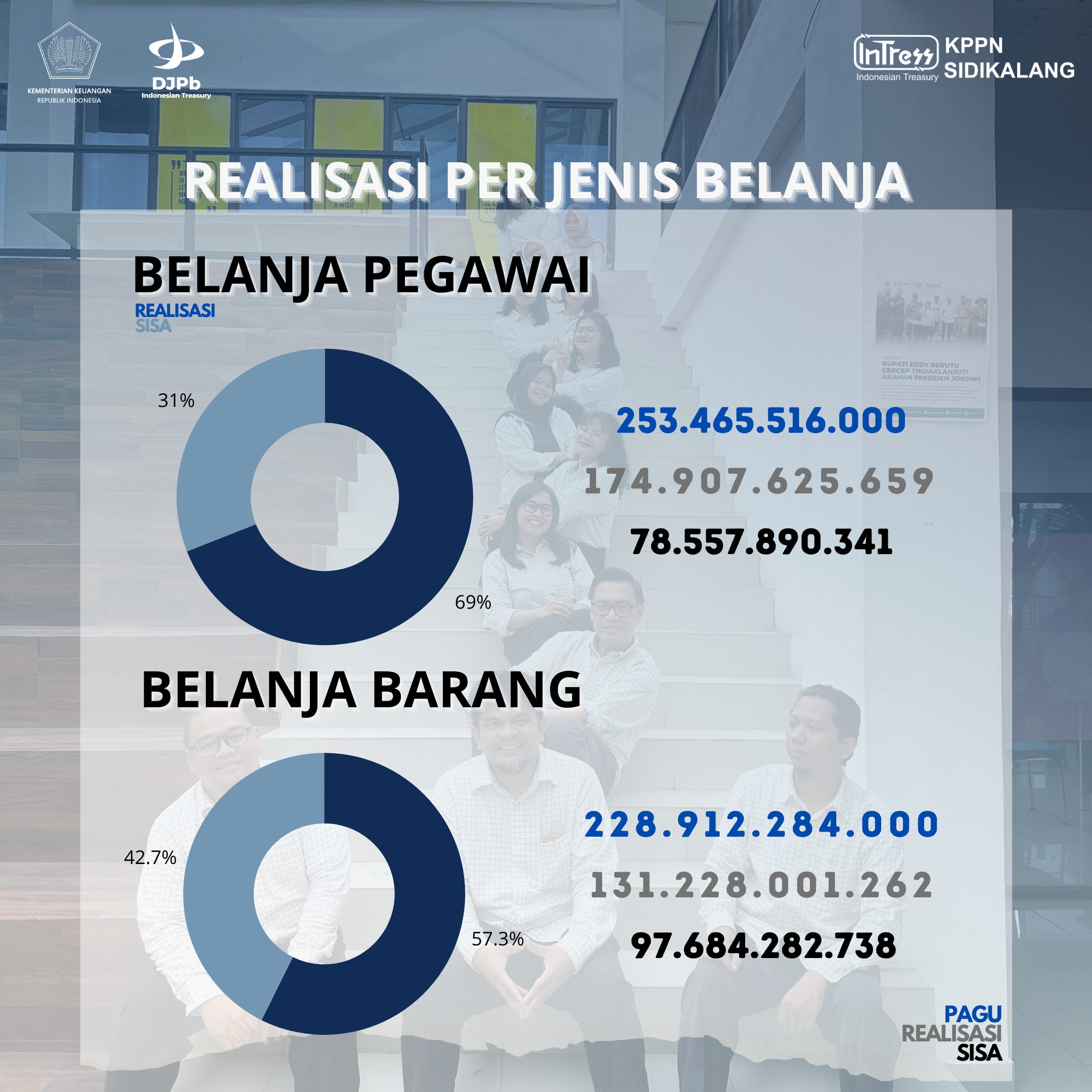 Dari total realisasi sebesar Rp2.849.642.696.372 tersebut, realisasi belanja pegawai adalah sebesar Rp216.884.493.918 atau 83.15% dari pagu sebesar Rp254.710.204.000. Untuk realisasi belanja barang sebesar Rp175.086.068.821 atau 66.87% dari pagu sebesar Rp261.812.957.000. Realisasi belanja modal terdapat sebesar Rp1.823.143.200 atau sebesar 85.21% dari pagu Rp2.139.532.000.