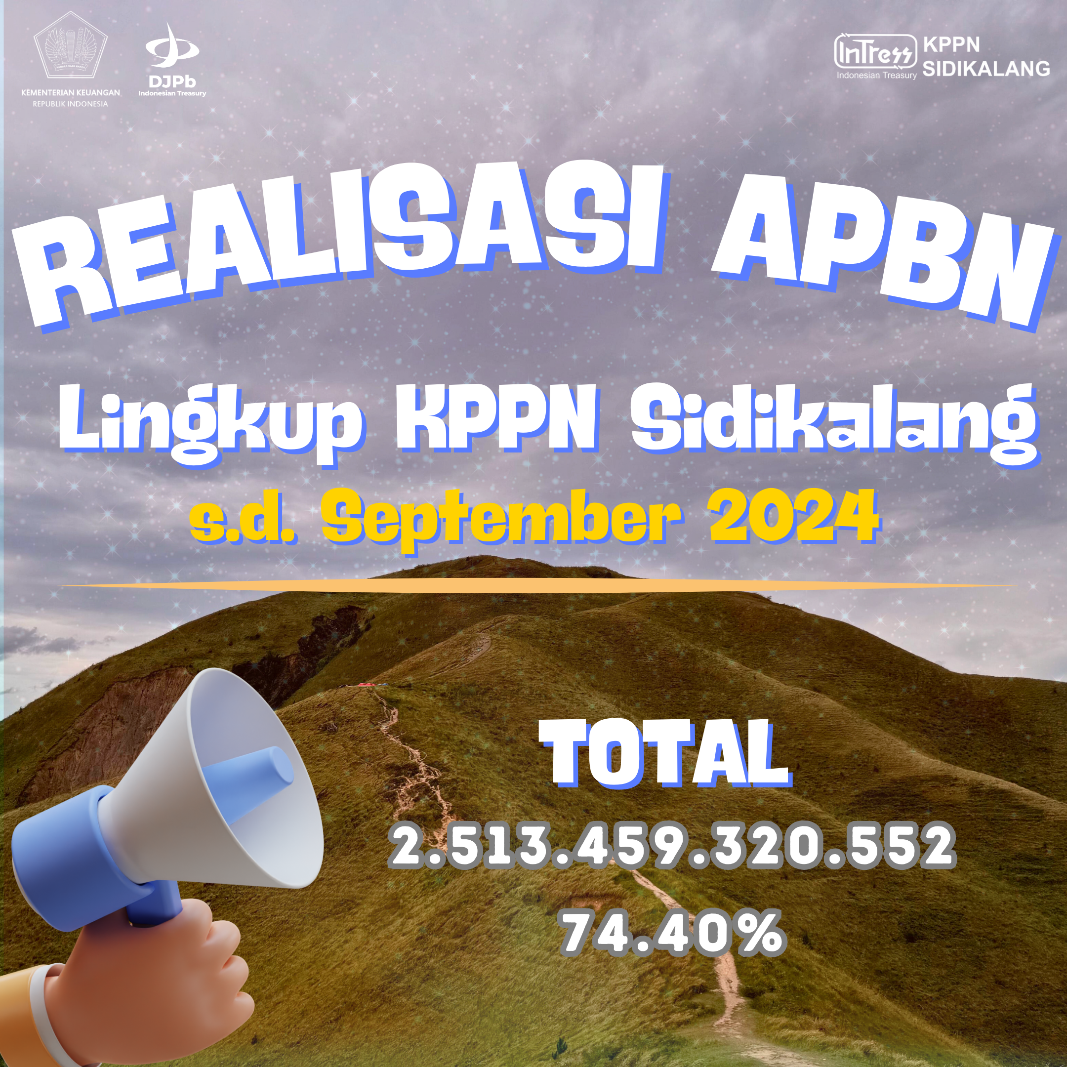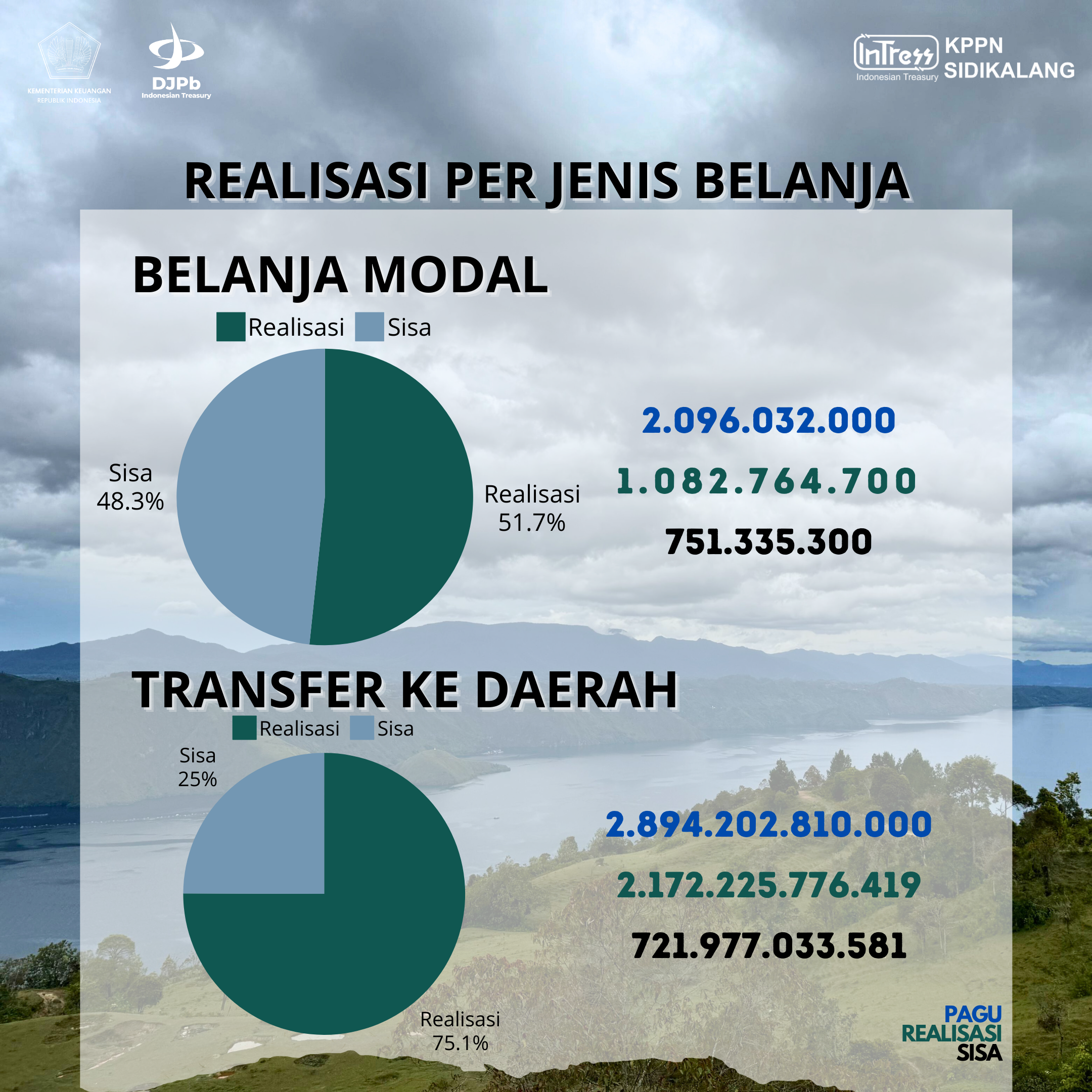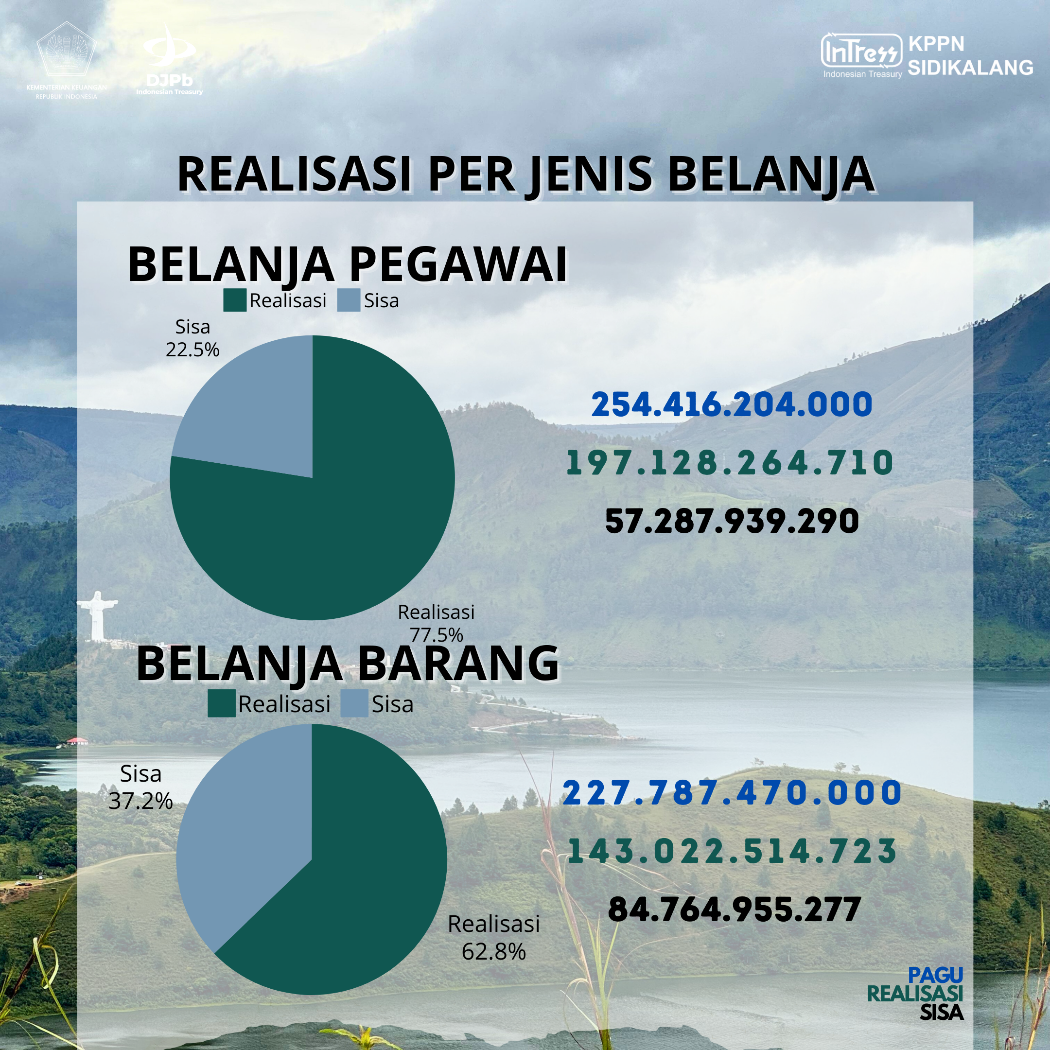 Realisasi Belanja Lingkup KPPN Sidikalang sampai dengan 31 Oktober 2024 adalah sebesar Rp2.849.642.696.372 atau senilai 83.50% dari pagu Rp3.412.865.503.000. Data ini diambil dari Online Monitoring SPAN yang meliputi wilayah kerja KPPN Sidikalang yaitu Kabupaten Dairi, Kabupaten Karo dan Kabupaten Pakpak Bharat.