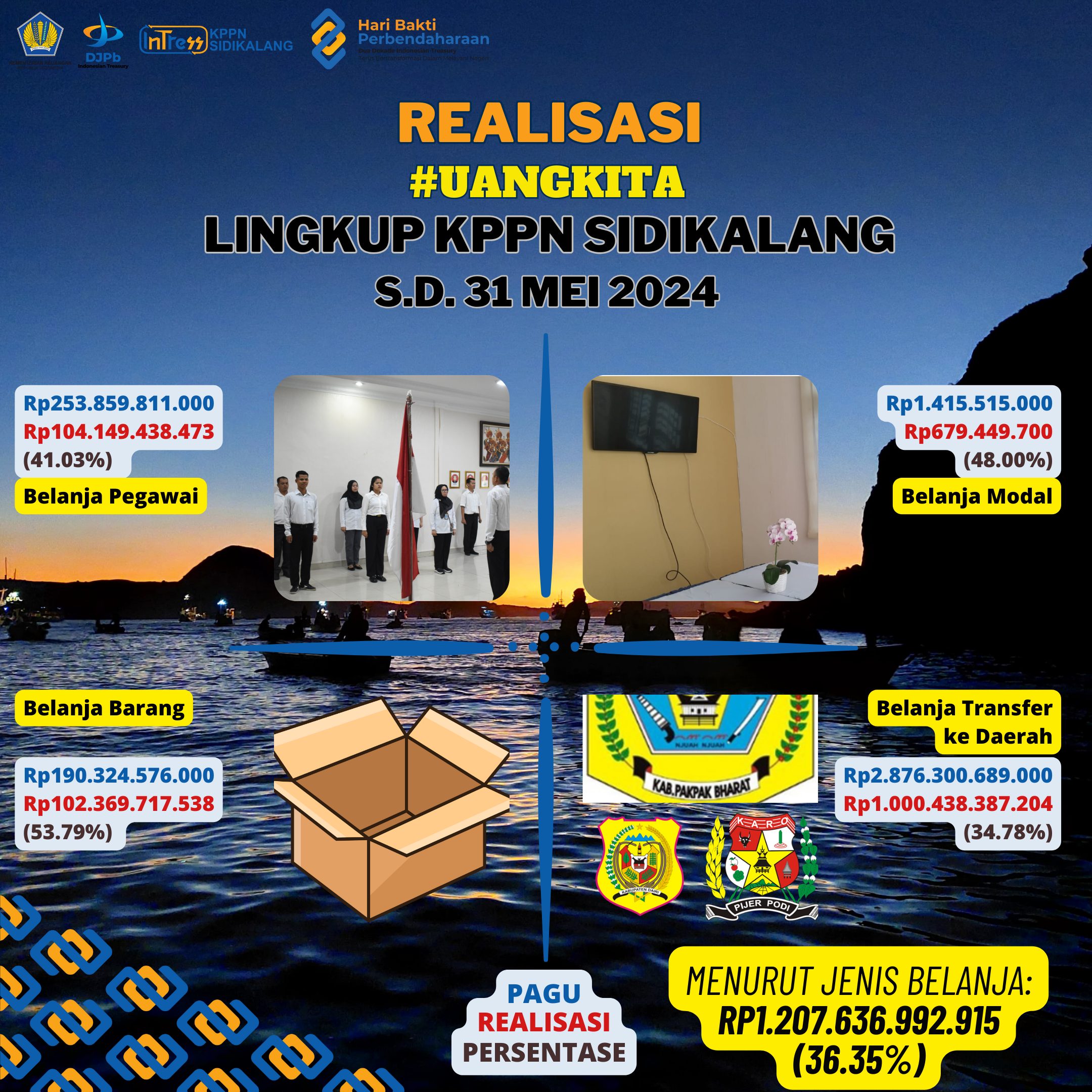 Realisasi Belanja Lingkup KPPN Sidikalang sampai dengan 31 Mei 2024 adalah sebesar Rp1.207.636.992.915 atau senilai 36.35% dari pagu Rp3.321.900.591.000. Data ini diambil dari Online Monitoring SPAN yang meliputi wilayah kerja KPPN Sidikalang yaitu Kabupaten Dairi, Kabupaten Karo dan Kabupaten Pakpak Bharat.
