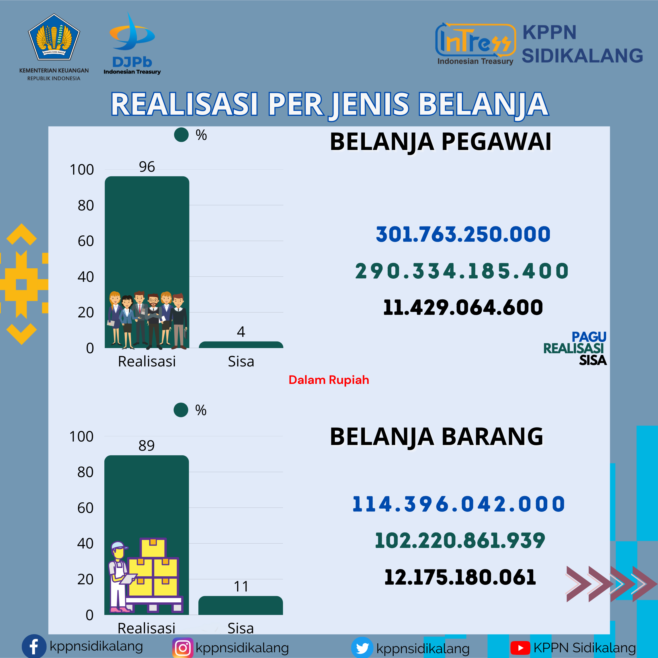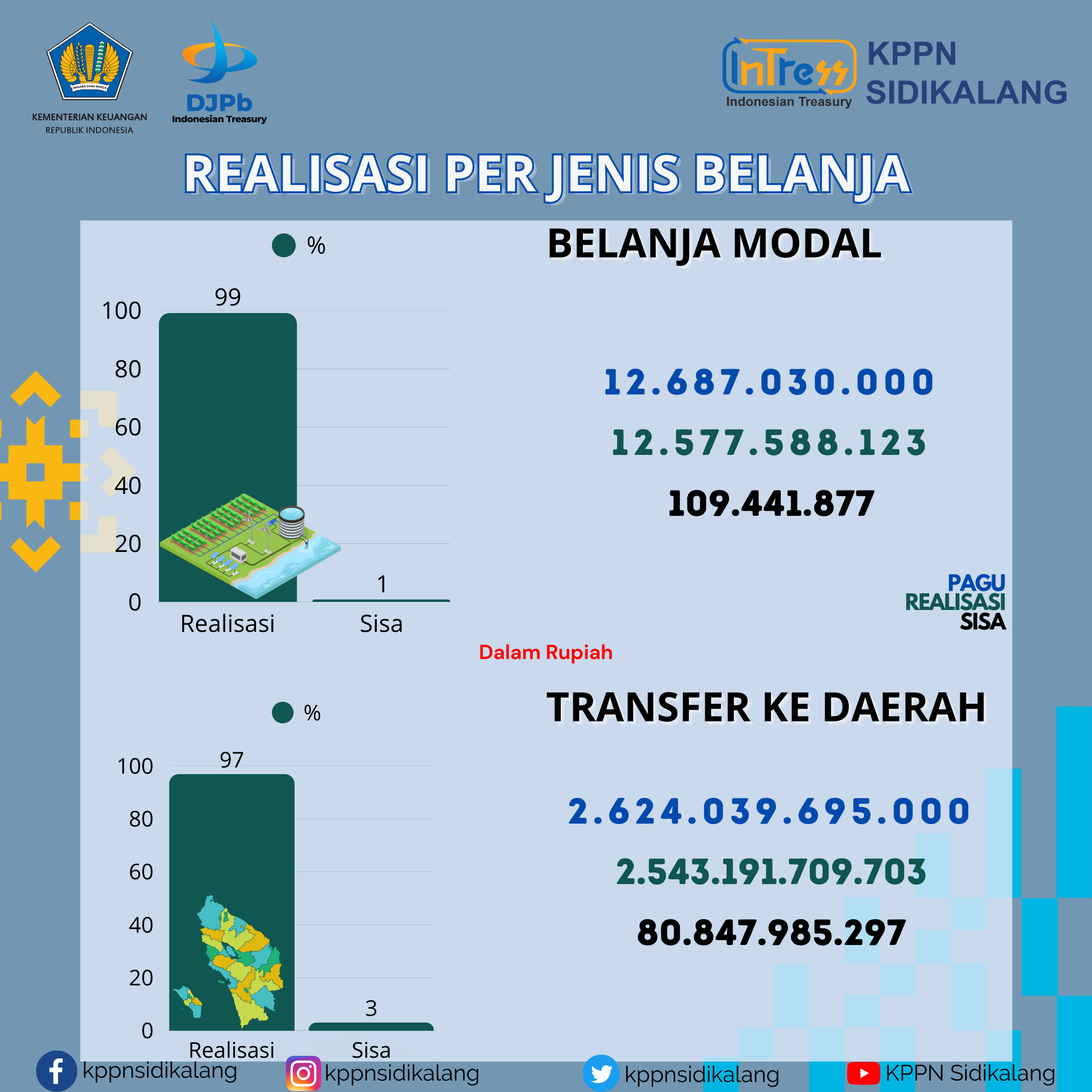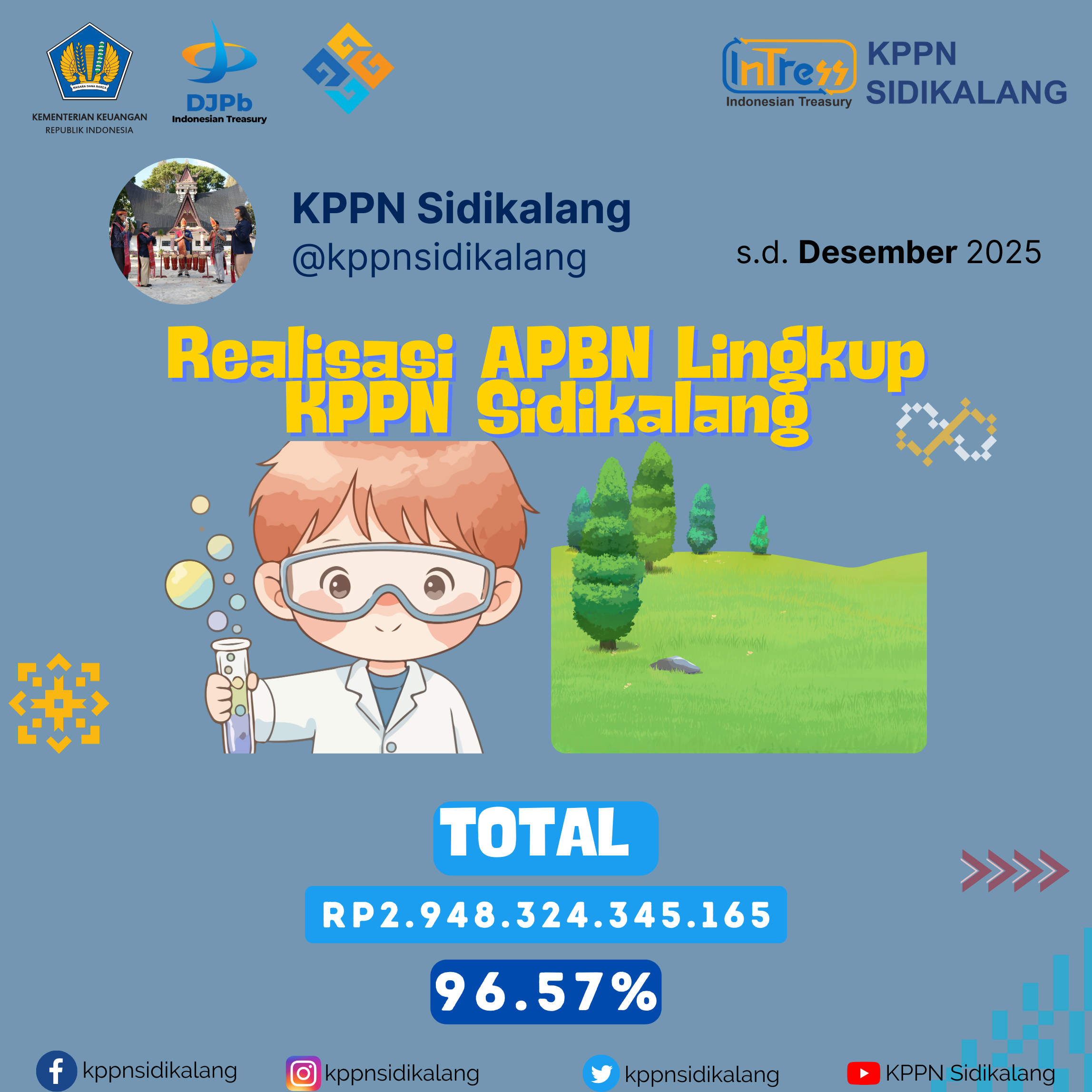 Realisasi Belanja Lingkup KPPN Sidikalang sampai dengan 31 Desember 2025 adalah sebesar Rp2.948.324.345.165 atau senilai 96.57% dari pagu total Rp3.052.886.017.000. Data ini diambil dari Online Monitoring SPAN yang meliputi wilayah kerja KPPN Sidikalang yaitu Kabupaten Dairi, Kabupaten Karo dan Kabupaten Pakpak Bharat.