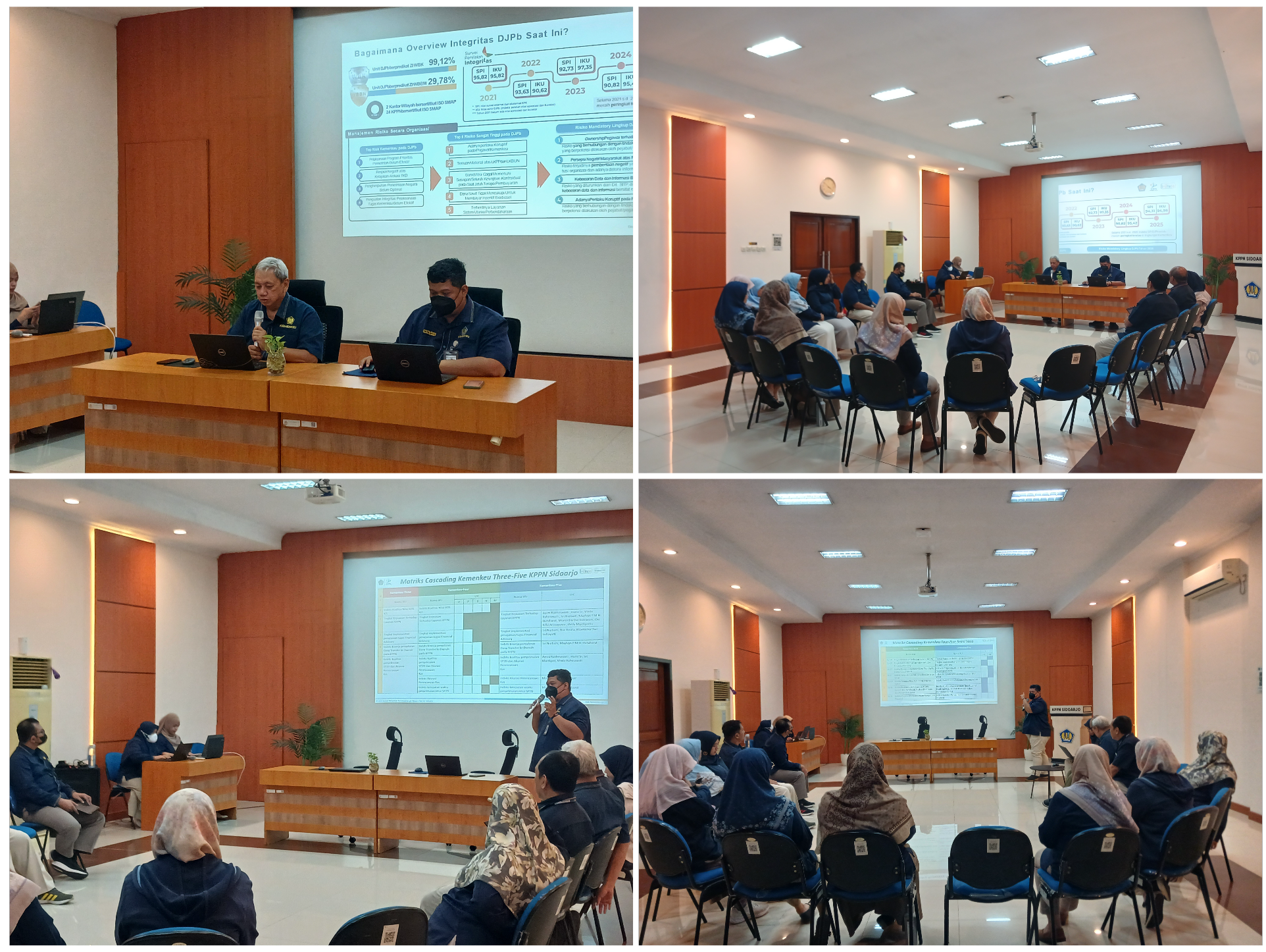 Pada sesi pemaparan materi, disampaikan gambaran umum integritas di lingkungan Direktorat Jenderal Perbendaharaan. DJPb mencatat capaian yang sangat baik pada penguatan zona integritas, dengan 99,12 persen unit kerja berpredikat Wilayah Bebas dari Korupsi (WBK) dan 29,78 persen berpredikat Wilayah Birokrasi Bersih dan Melayani (WBBM). KPPN Sidoarjo sendiri telah meraih predikat WBBM pada tahun 2024 serta memiliki sertifikasi ISO Sistem Manajemen Anti Penyuapan (SMAP) sebagai komitmen nyata dalam pencegahan korupsi dan penguatan tata kelola.