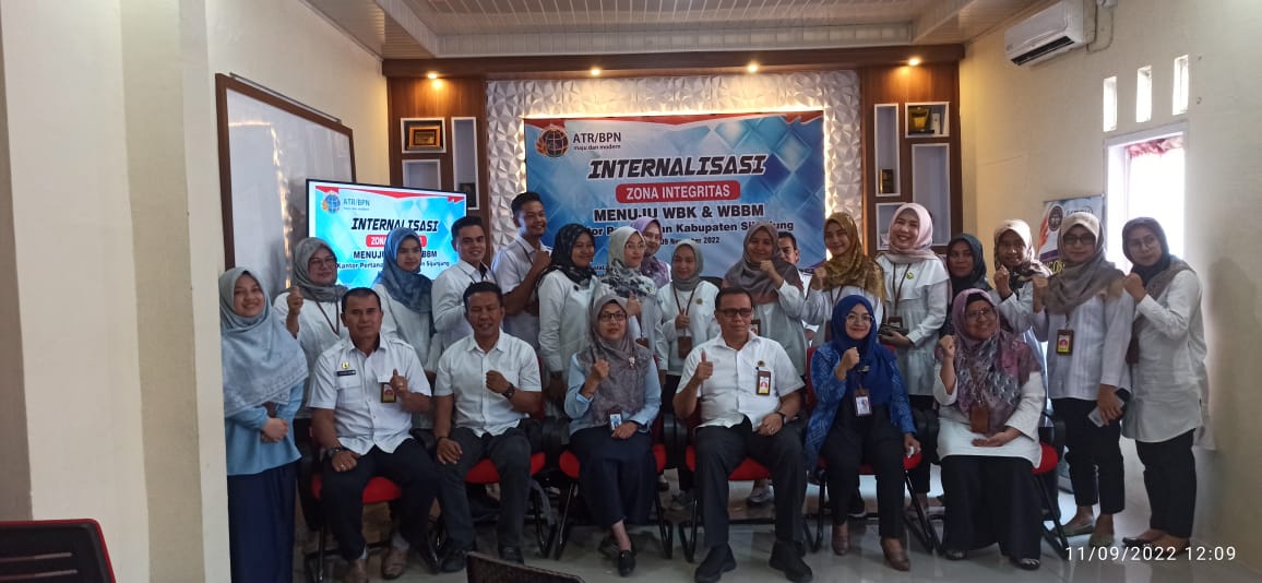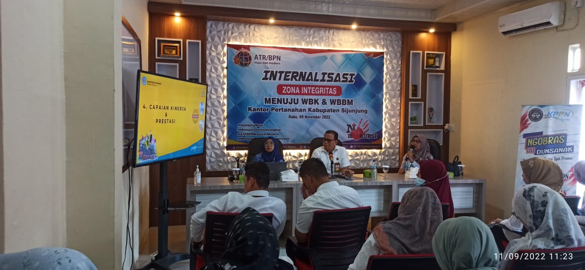 Sijunjung – Pada hari Rabu, 9 November 2022, telah dilaksanakan Sharing Session/Internalisasi Pembangunan ZI menuju WBK/WBBM di Aula Kantor Pertanahan Kabupaten Sijunjung. Kegiatan ini berjalan dengan baik, interaktif, dan informatif.Acara dibuka dengan sambutan dari Kepala Kantor Pertanahan Kab. Sijunjung, Bapak Hanif, S.Si.T. Kemudian dilanjutkan dengan pemaparan materi dengan narasumber Ibu Meilisa Fitri Harahap selaku perwakilan ombudsman dan Ibu Hafnizar selaku Kepala KPPN Sijunjung.
