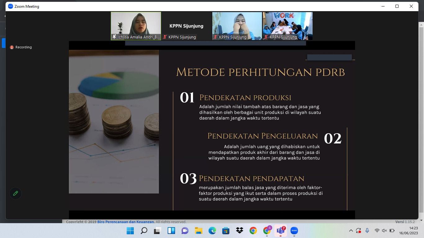 Pada hari Jumat tanggal 16 juni 2023 KPPN Sijunjung melakukan FGD bersama BPS Sawahlunto untuk membahas Analisis ekonomi Kota Sawahlunto secara daring melalui media Zoom Meeting. Kegiatan ini dilaksanakan dalam rangka mengembangkan kompetensi pegawai dalam bidang data analytics dalam rangka penguatan dan penajaman peran KPPN sebagai Treasury Financial Advisory.