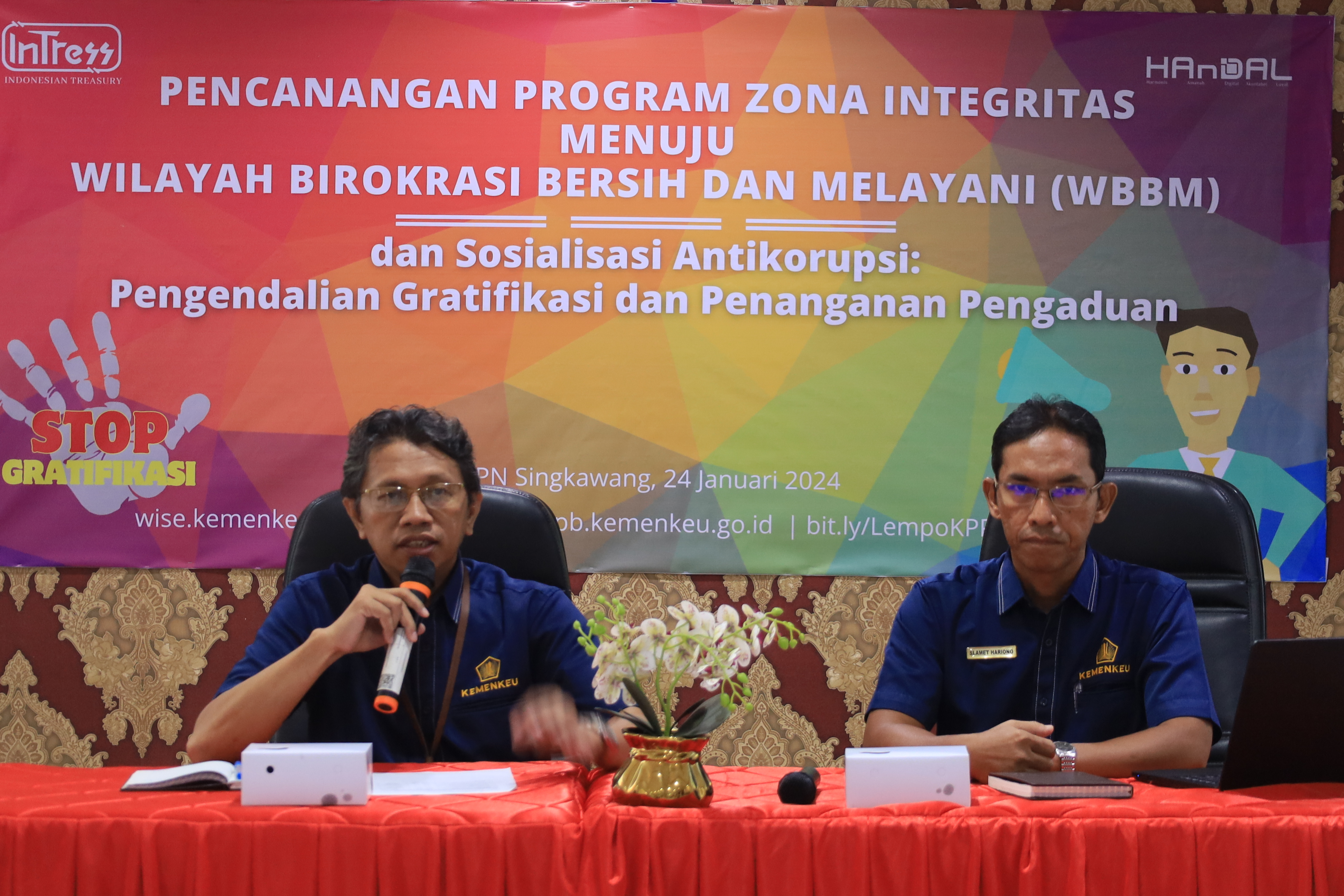 Kegiatan dilaksanakan pada hari Rabu, tanggal 24 Januari 2024 bertempat di Aula Firdaus KPPN Singkawang. Kegiatan dihadiri oleh KPA dari satuan kerja mitra kerja atau yang mewakili dan dibuka oleh Kepala KPPN Singkawang, Bapak Bulus Lumban Gaol. Dalam sambutannya, Bapak Bulus memaparkan gambaran program pembangunan ZI menuju WBBM yang sedang dilaksanakan oleh KPPN Singkawang dan menyampaikan materi terkait antikorupsi antara lain : pengendalian gratifikasi, penanganan pengaduan dan benturan kepentingan.