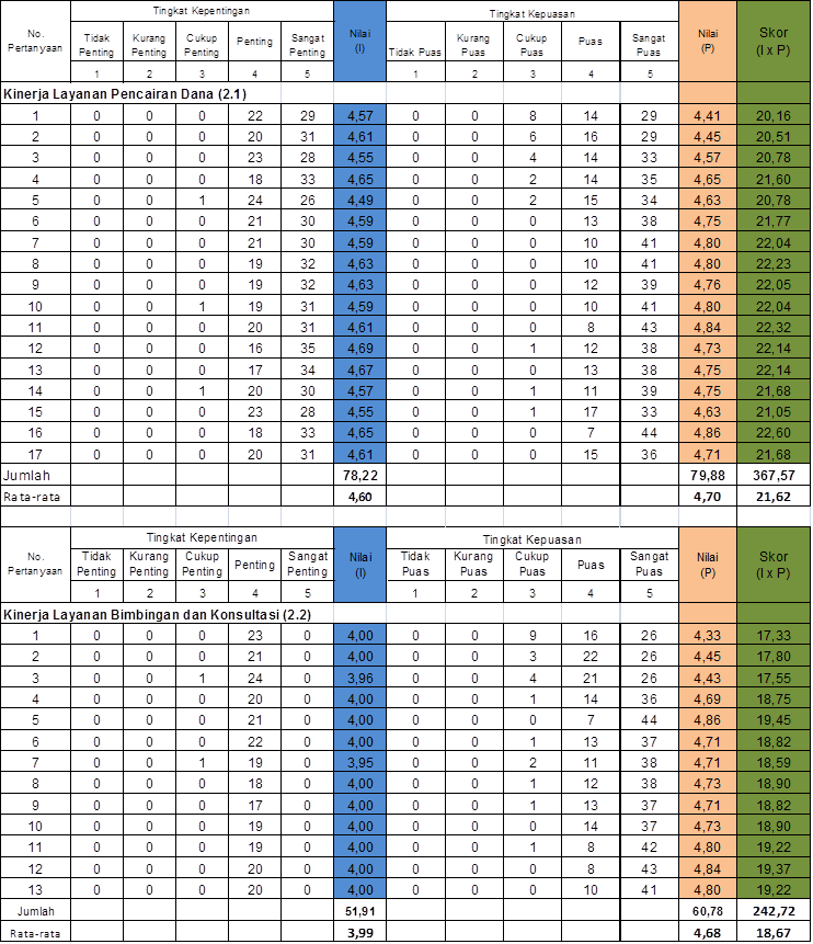 a. Jumlah nilai rata-rata hasil perhitungan tingkat kepentingan untuk Layanan Pencairan dana adalah sebesar 78,22 dan skor Layanan Pencairan dana adalah sebesar 367,57.