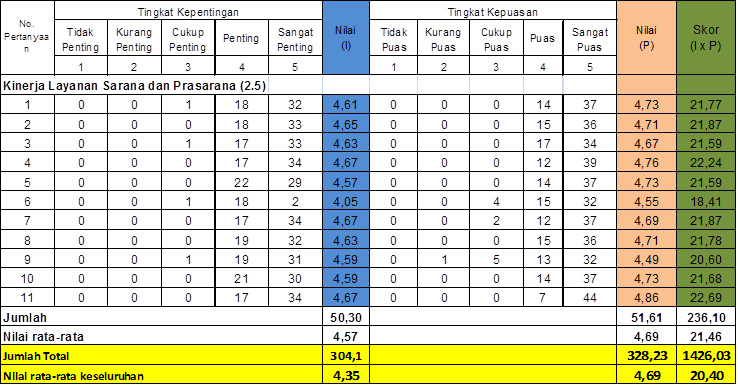 e. Jumlah nilai rata-rata hasil perhitungan tingkat kepentingan untuk Sarana dan Prasarana adalah sebesar 50.30 dan skor Sarana dan Prasarana adalah sebesar 10.
