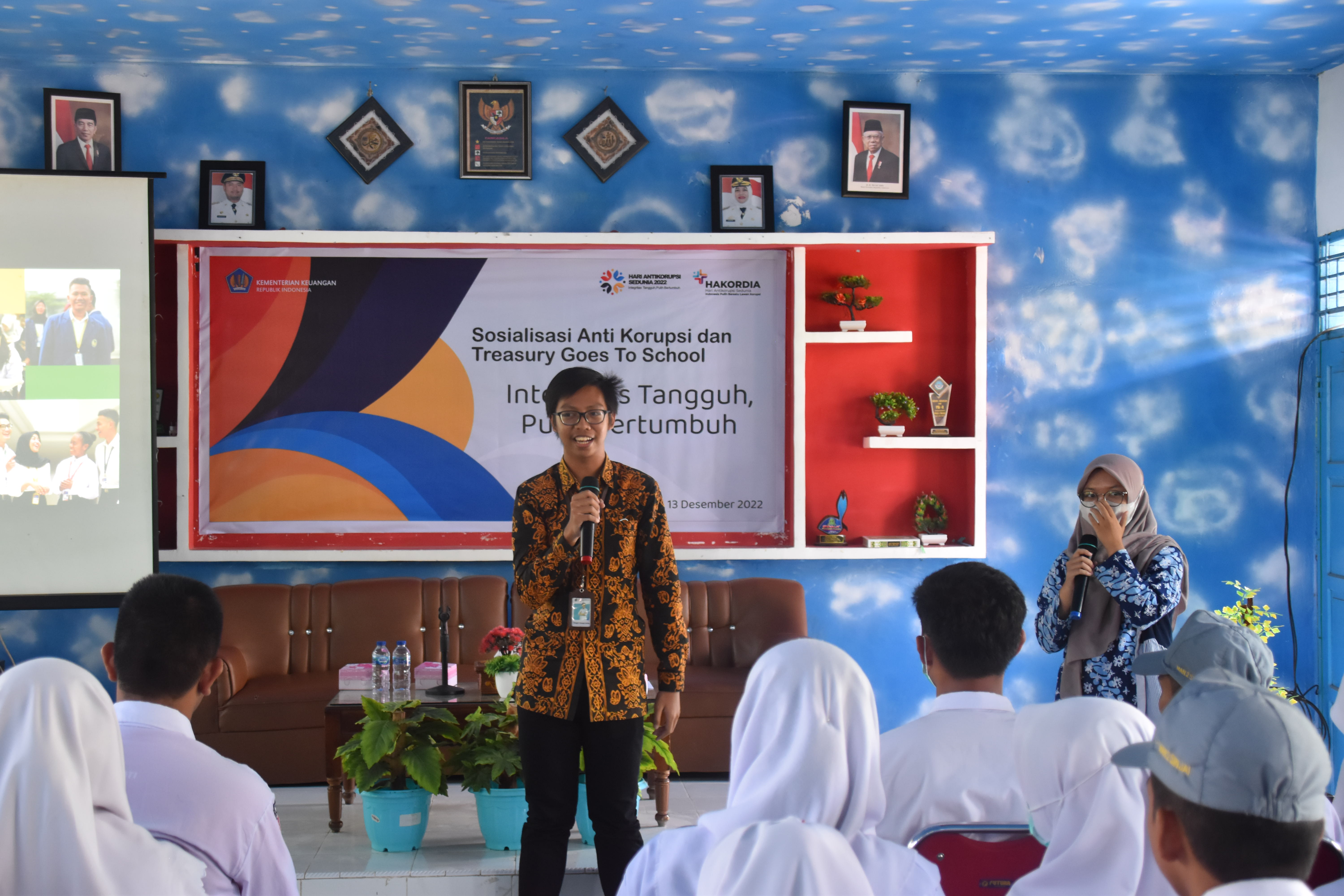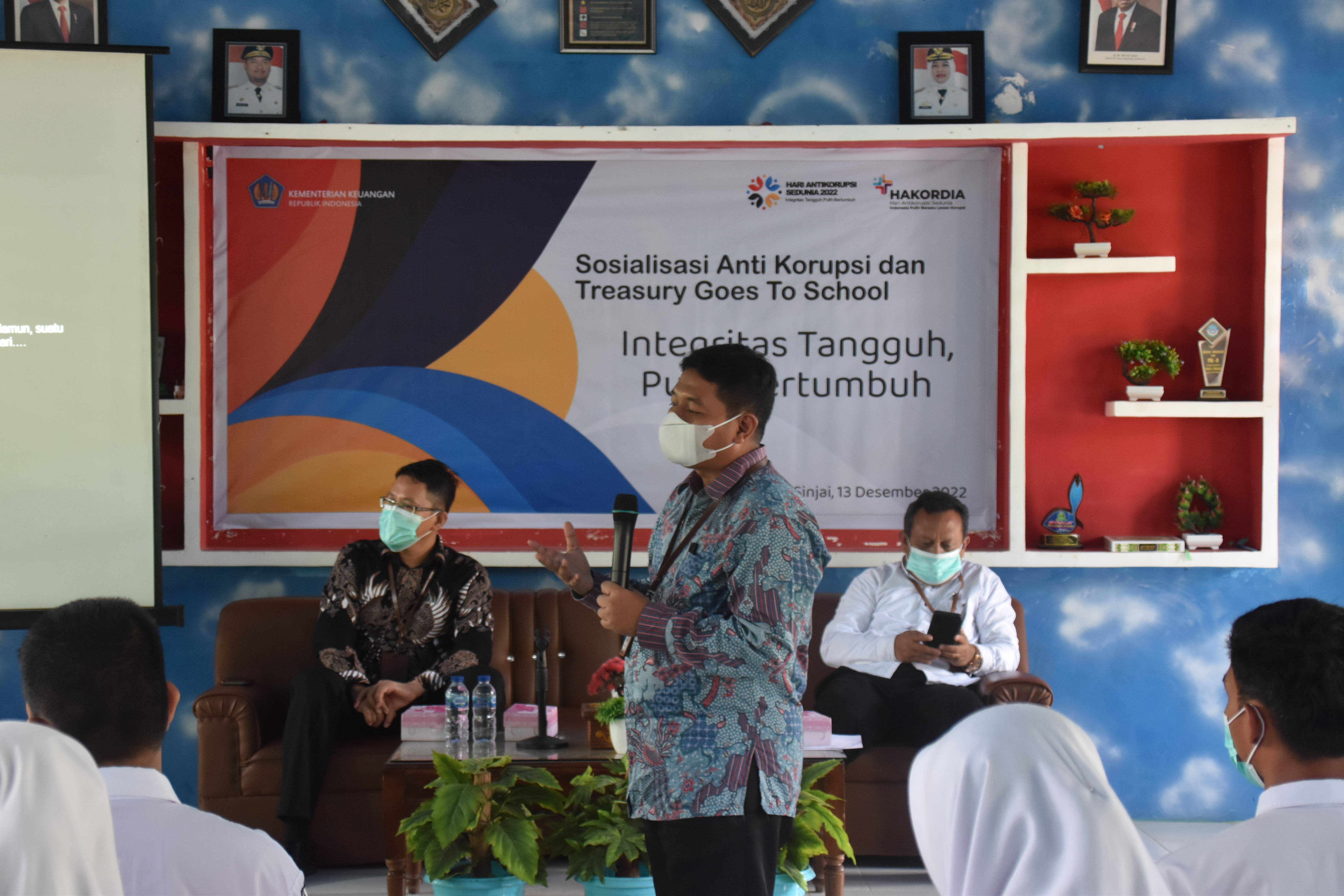 Kegiatan Sosialisasi Antikorupsi dan Treasury Goes To School dilaksanakan pada 13 Desember 2022 dan bertempat di Aula KPPN Sinjai. Kegiatan dihadiri oleh 61 siswa/i yang terdiri dari 25 siswa/i MAN 2 Sinjai dan 36 siswa/i MAN 1 Sinjai. Adapun materi yang disampaikan adalah overview atau pengenalan APBN, sosialisasi antikorupsi, dan pengenalan PKN STAN. Bertindak sebagai narasumber materi pengenalan APBN adalah Kepala KPPN Sinjai, Arif Kurniadi, dan menjelaskan mengenai definisi APBN, postur APBN, dan makna penting APBN dalam kehidupan sehari-hari. Untuk materi sosialisasi antikorupsi disampaikan oleh Kepala Seksi VeraKI, Anthon Misalayuk, sedangkan materi pengenalan PKN STAN disampaikan oleh Pelaksana Seksi VeraKI, Canggih Hangga Larang.
