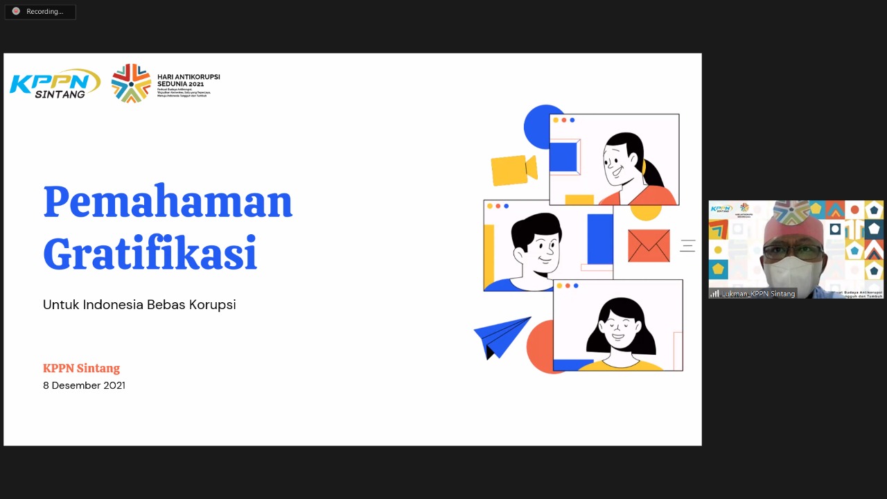 Setiap tanggal 9 Desember diperingati sebagai Hari Antikorupsi Sedunia atau yang biasa disingkat Hakordia. Di masa pandemic Covid-19, KPPN Sintang tetap memperingati Hakordia dengan kembali menyebarkan semangat Anti Korupsi dengan berbagai bentuk. Diantara kegiatan tersebut adalah acara virtual via zoom antar pegawai KPPN Sintang dengan mitra satuan kerja pada Hari Rabu, 8 Desember 2021, dengan tema ”DJPb Handal, DJPb BIJAK (terus Berkarya, kuatkan Integritas, Jaga semangat Anti Korupsi."