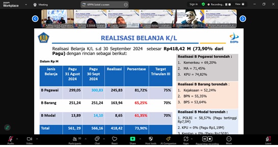 “Per 30 September 2024, KPPN Solok telah menyalurkan belanja negara senilai Rp2,24 triliun atau 76,38% dari total pagu sebesar Rp2,93 triliun. Pagu tersebut mengalami kenaikan Rp8,07 miliar dari pagu bulan lalu. Adapun pagu yang mengalami kenaikan adalah belanja pegawai Rp1,77 miliar, belanja barang Rp2,90 miliar, belanja modal Rp212,13 Juta, dan Dana Desa Rp3,20 miliar”. Hal tersebut disampaikan oleh Ibu Ikasari Heniyatun, Kepala KPPN Solok, dalam acara press release APBN periode Triwulan III Kamis lalu.