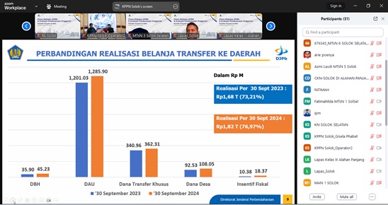 Selanjutnya Kepala KPPN Solok menyampaikan realisasi Belanja Transfer ke Daerah s.d 30 September 2024 mencapai Rp1,82 triliun atau 76,97% dari Pagu anggaran. TKD yang telah disalurkan berupa DBH senilai Rp45,22 miliar, DAU senilai Rp1.285,90 miliar, Dana Transfer Khusus senilai Rp362,31 miliar, Dana Desa senilai Rp108,05 miliar, dan Dana Insentif Fiskal senilai Rp18,37 miliar.