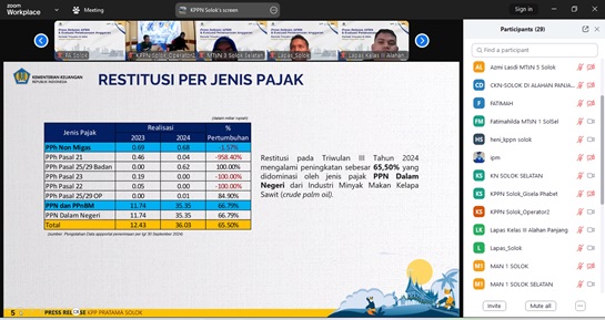 Setoran Wajib Pajak Bendahara pada Triwulan III 2024 pada wilayah kerja KPP Pratama Solok sebesar Rp 140,63 M dengan pertumbuhan sebesar 2,09% dibanding tahun sebelumnya, dimana Kabupaten Solok merupakan wilayah dengan penerimaan pajak terbesar dengan capaian senilai Rp29,47 miliar. Oleh karena itu, KPP Pratama Solok mengucapkan apresiasi kepada seluruh satker atas capaian ini.
