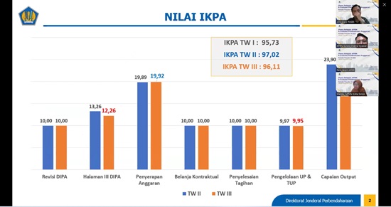 “Pada periode triwulan III ini, IKPA KPPN Solok masih mencapai kategori sangat baik. Namun demikian, terdapat dua indikator IKPA yang mengalami penurunan yaitu Deviasi Halaman III DIPA dan Pengelolaan UP/TUP. Deviasi halaman III DIPA masih merupakan indikator dengan nilai terendah. Hal ini diharapkan dapat diminimalisir pada triwulan IV melalui pengajuan proses pengajuan tagihan ke KPPN sesuai dengan RPD yang telah dimutakhirkan pada awal Oktober ini”, pesan Ibu Heni.