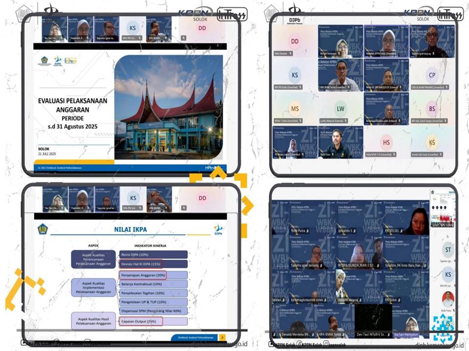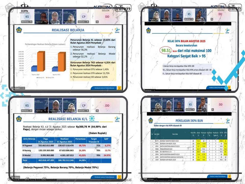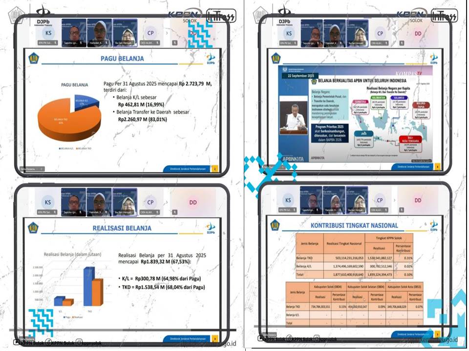 Kinerja APBN dari sisi pengeluaran sampai dengan peride Agustus 2025 telah mencapai 67,53% dari Total Pagu Anggaran sebesar Rp 1.839,32 Miliar, hal tersebut disampaikan oleh Ikasari Heniyatun selaku Kepala Kantor Pelayanan Perbendaharaan Negara (KPPN) Tipe A1 Solok.