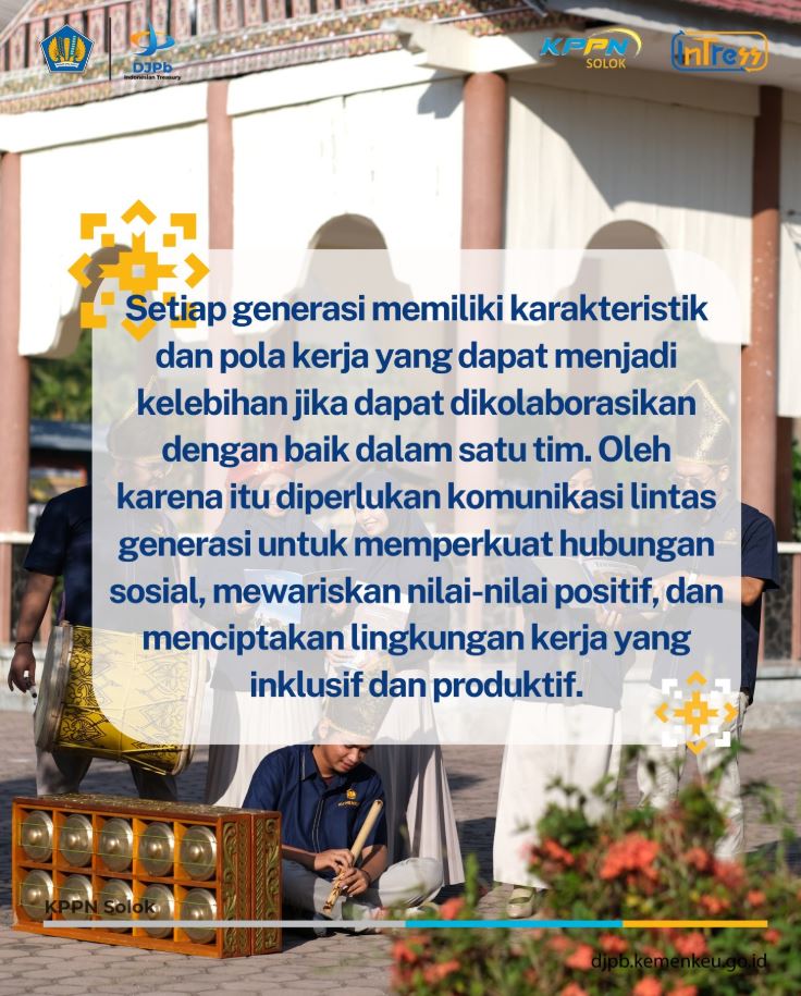 Dengan menggabungkan pengalaman dan kebijakan matang dari Gen X, pengetahuan serta kegigihan Gen Y, serta solusi cepat dan praktis dari generasi milenial, terciptalah sinergi yang menghasilkan output luar biasa bagi KPPN Solok.