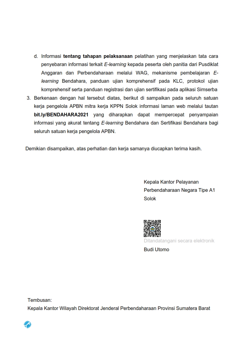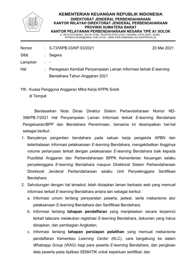 S-73/WPB.03/KP.03/2021 Tanggal 20 Mei Hal Penegasan Kembali Penyampaian Laman Informasi terkait E-learning Bendahara Tahun Anggaran 2021