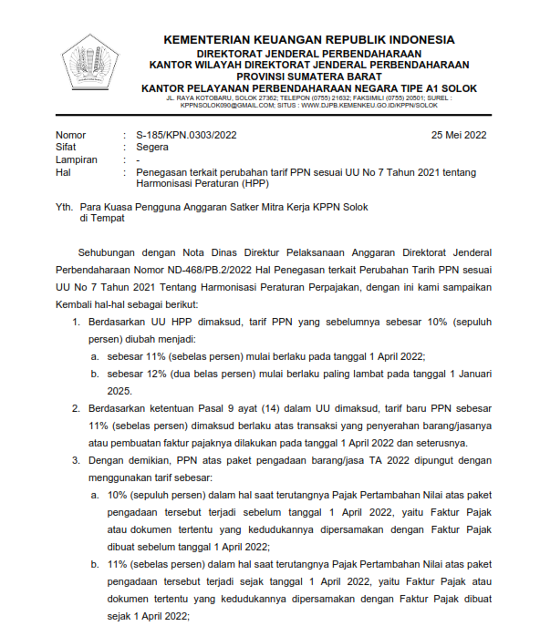Surat Kepala KPPN Solok Nomor S-185/KPN.0303/2022 Tanggal 25 Mei 2022 Hal Penegasan terkait Perubahan Tarif PPN Sesuai UU No 7 Tahun 2021