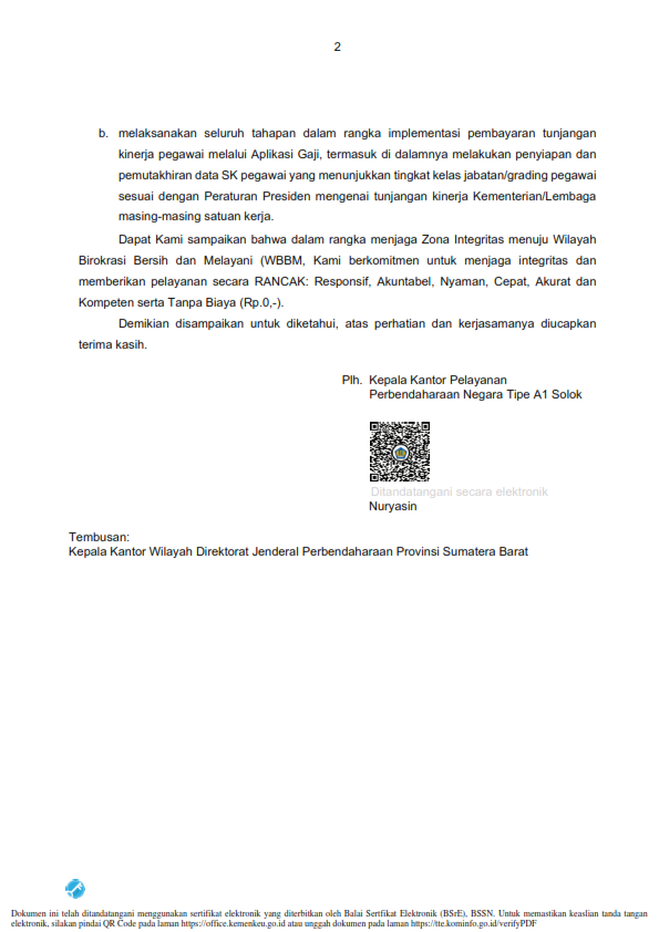 Surat Kepala KPPN solok Nomor S-390/KPN.0303/2023 Tanggal 02 Desember 2023 Hal Pelaksanaan Pembayaran Tunjangan Kinerja Pegawai Pada Kementerian/Lembaga Melalui Aplikasi Gaji