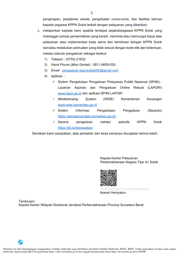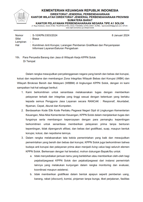 Surat Kepala KPPN Solok Nomor S-10/KPN.0303/2024 Tanggal 08 Januari 2024 Hal Komitmen Anti Korupsi, Larangan Pemberian Gratifikasi dan Penyampaian Informasi Layanan/Saluran Pengaduan (Penyedia Barang dan Jasa)