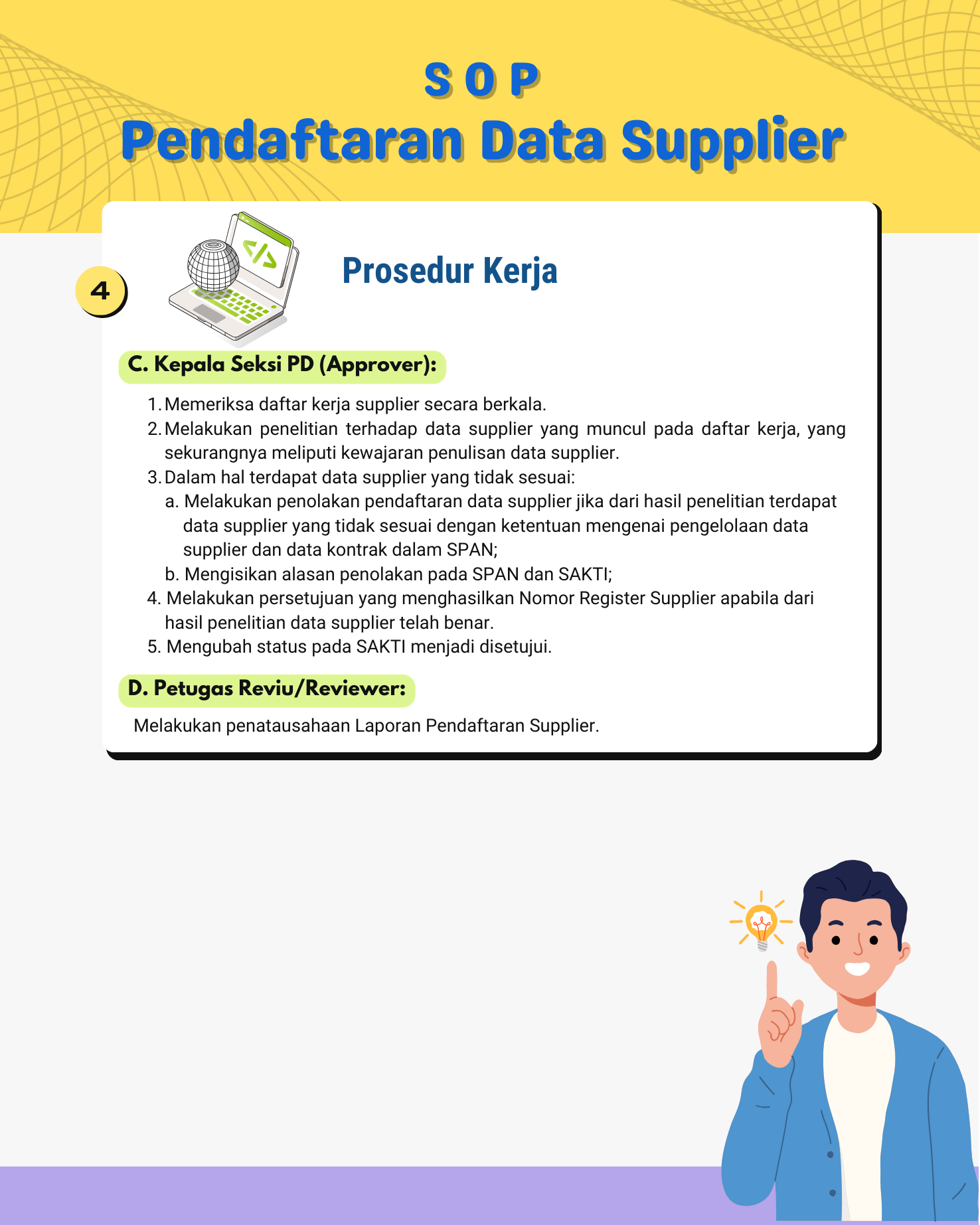- Melakukan penolakan pendaftaran data supplier jika dari hasil penelitian terdapat data supplier yang tidak sesuai dengan ketentuan mengenai pengelolaan data supplier dan data kontrak dalam SPAN;