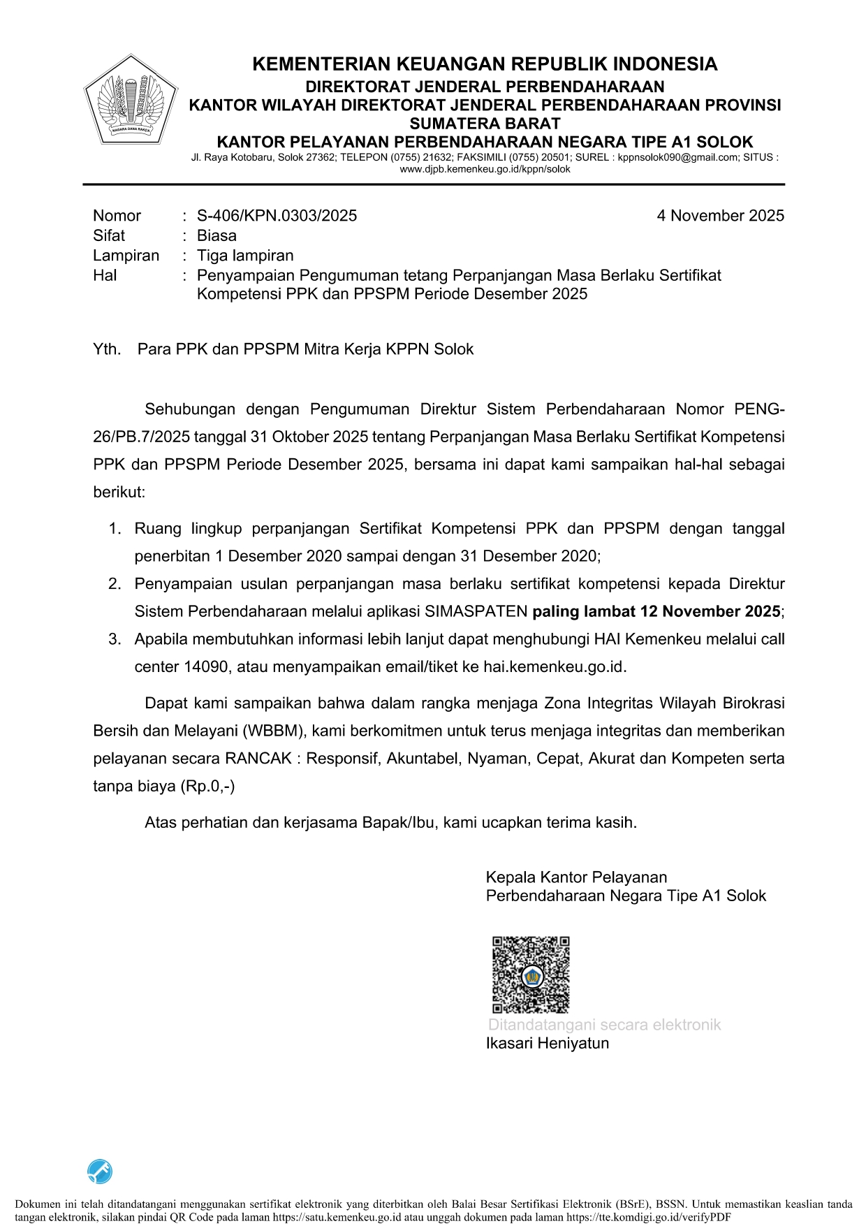 S-406/KPN.0303/2025 Tentang Penyampaian Pengumuman Perpanjangan Masa Belaku Sertifikasi Kompetensi PPK dan PPSPM Periode Desember 2025