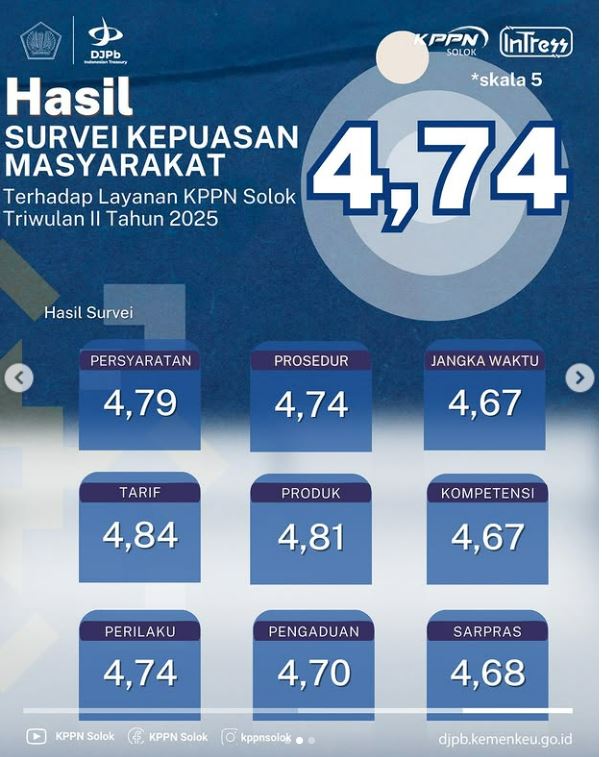 Dalam rangka mengukur tingkat kualitas pelayanan yang diebrikan oleh Kantor Pelayanan Perbendaharaan Negara (KPPN) Solok Kepada Mitra Kerja pada periode Triwulan II Tahun 2025 disampaikan bahwa telah dilaksanakan Survei Kepuasan Layanan pada tanggal 25 sd 30 Juni 2025.