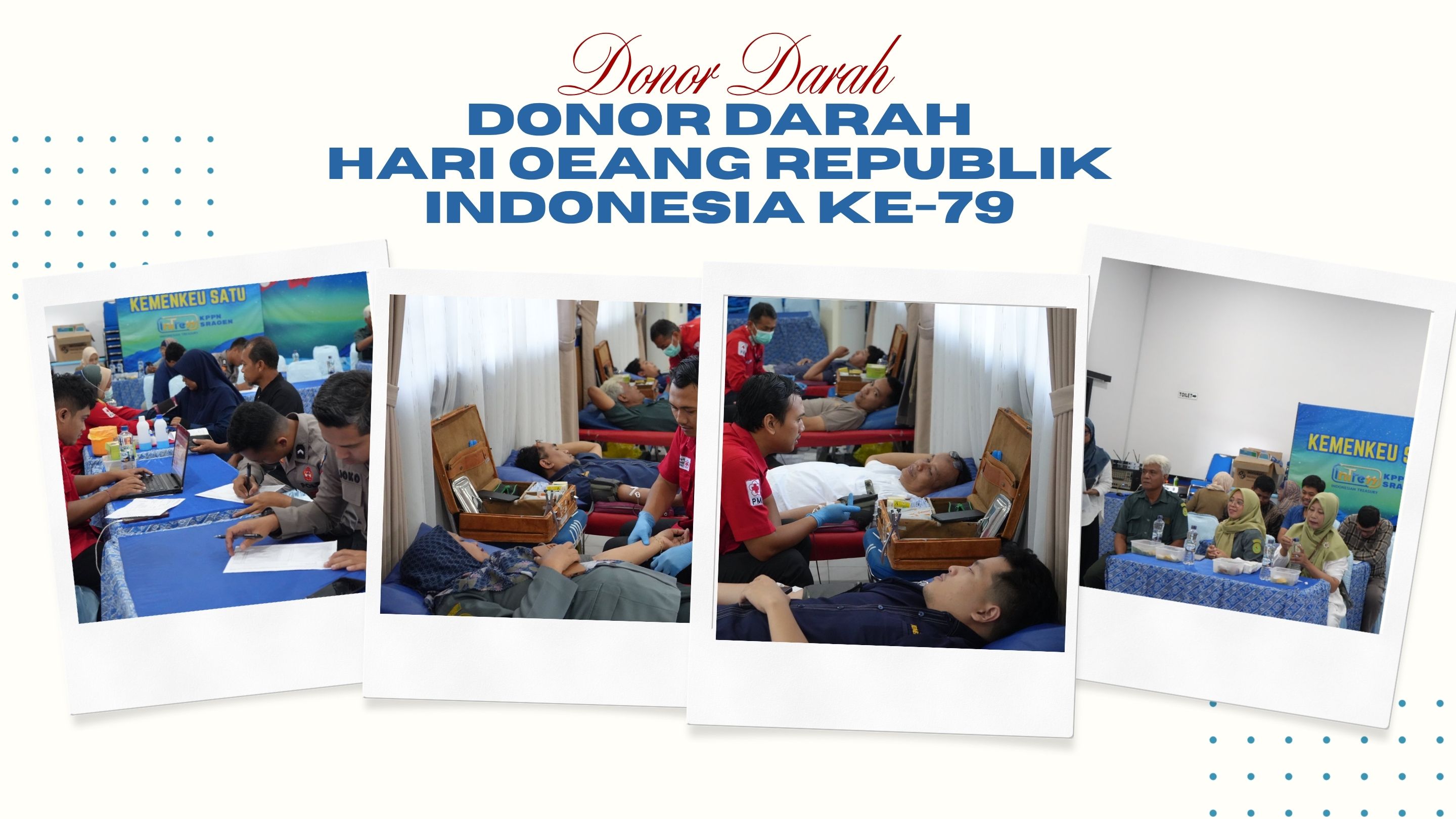 KPPN Sragen menggelar kegiatan Donor Darah dengan bekerja sama dengan PMI Kabupaten Sragen yang bertempat di Gedung Aula Kantor Pelayanan Perbendaharaan Negara Tipe A2 Sragen pada Rabu, 22 Oktober 2025. Dalam kegiatan ini calon pendonor yang berpartisipasi berasal dari Pegawai KPPN Sragen beserta keluarga dan Pegawai dari Satuan Kerja Mitra Kerja KPPN Sragen. Kegiatan rutin yang dilaskanakan secara tahunan, pada periode ini sekaligus sebagai bagian dari kegiatan peringatan Hari Oeang Republik Indonesia (HORI) yang ke-79 Tahun 2025.Kegiatan donor darah dimulai pada pukul 08.00 WIB s.d 11.00 WIB dengan total jumlah 40 calon pendonor. Dari 40 calon pendonor, terdapat 32 peserta yang berhasil melakukan donor darah dan 8 diantaranya mengalami gagal donor darah karena belum memenuhi persyaratan yang ditentukan. Dari 32 kantong darah yang diperoleh, terdiri dari 8 kantong darah bergolongan darah A, 11 kantong darah bergolongan darah B, 2 kantong darah bergolongan darah B dan 11 kantong darah bergolongan O.