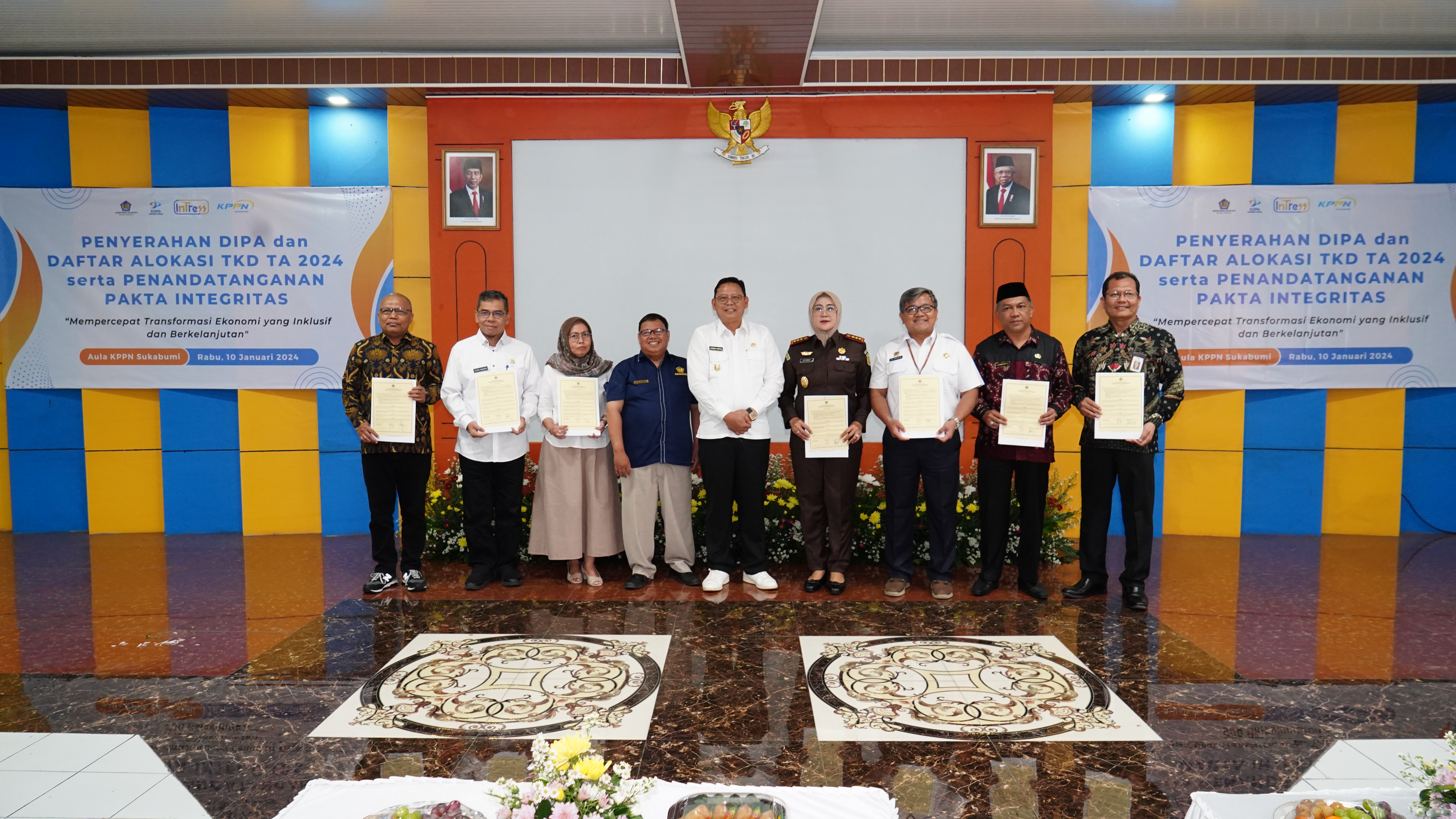 SUKABUMI – Pj. Walikota Sukabumi, Kusmana Hartadji, didampingi Kepala KPPN Sukabumi, Abdul Lutfi pada Rabu (10/01/2024) di aula KPPN Sukabumi melakukan penyerahan DIPA sekaligus menyaksikan penandatangan Pakta Integritas yang dilakukan secara simbolis oleh perwakilan satuan kerja. Penyerahan DIPA tahun 2024 ini ditandai dengan penekanan tombol penyerahan DIPA secara virtual oleh Pj. Walikota Sukabumi, Kusmana Hartadji.