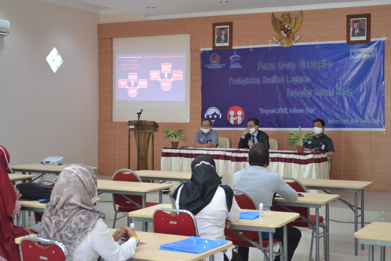 KPPN Sumbawa Besar - Pada hari Rabu, 26 Agustus 2020 dan hari Kamis. 27 Agustus 2020 bertempat di Aula KPPN Sumbawa Besar diadakan Kegiatan FGD Peningkatan Kualitas Layanan terhadap Satuan Kerja pada KPPN Sumbawa Besar.