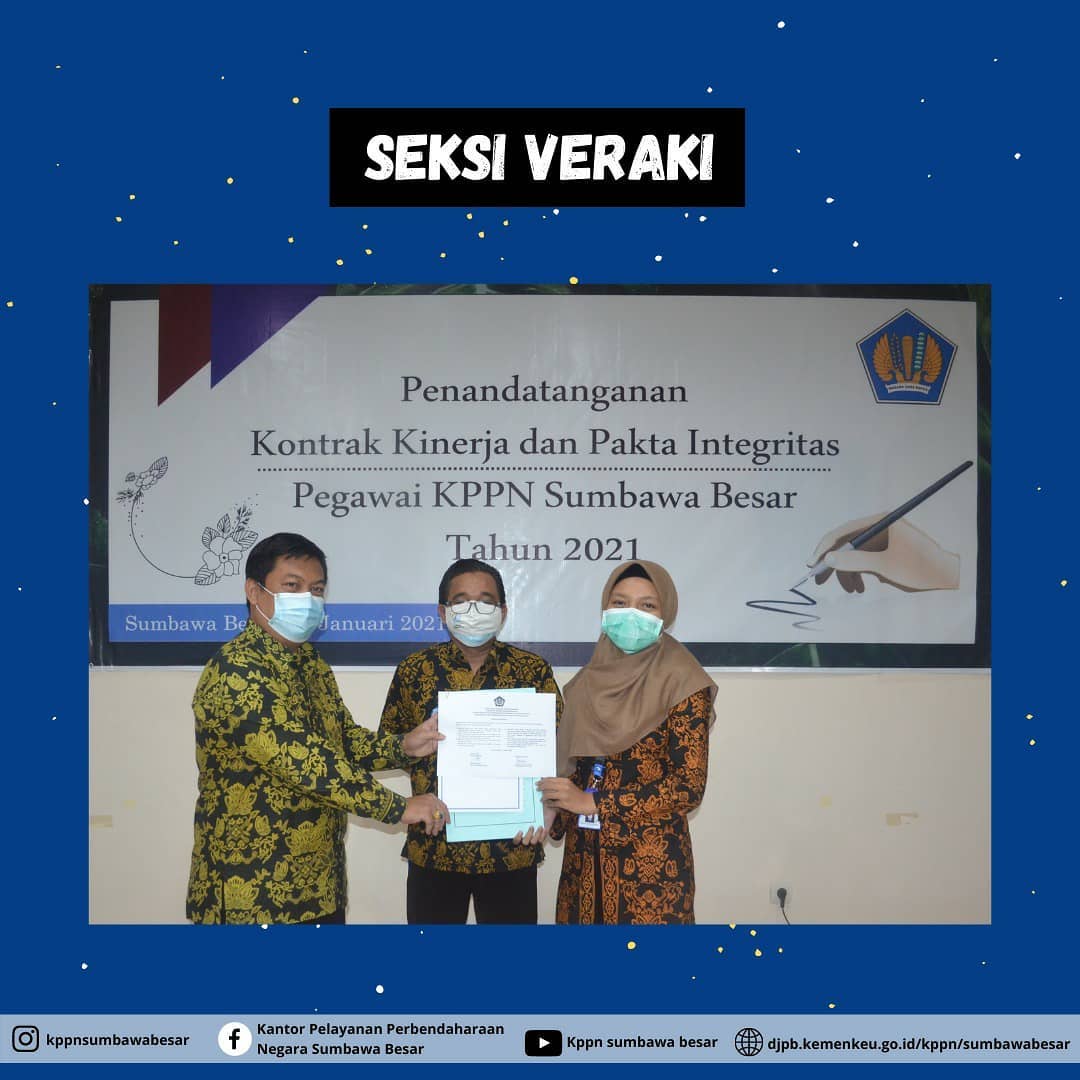 KPPN Sumbawa Besar, 28 Januari 2021 - Pada hari Kamis, 28 Januari 2021 telah dilaksanakan penandatanganan kontrak kinerja tahun 2021 dan pakta integritas di KPPN Sumbawa Besar. Diharapkan dengan kontrak kinerja ini, dapat terus memacu produktivitas dan semangat pegawai. Selain itu, penandatanganan pakta integritas adalah manifestasi dari komitmen KPPN Sumbawa Besar untuk terus menjaga integritas sesuai nilai pertama Kementerian Keuangan.