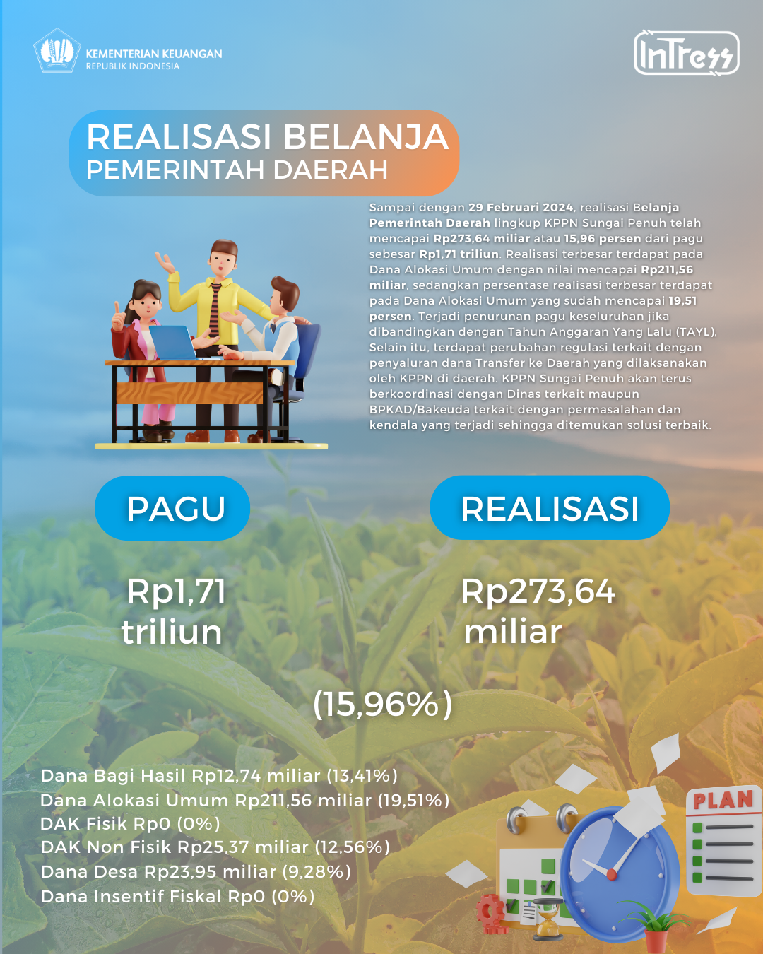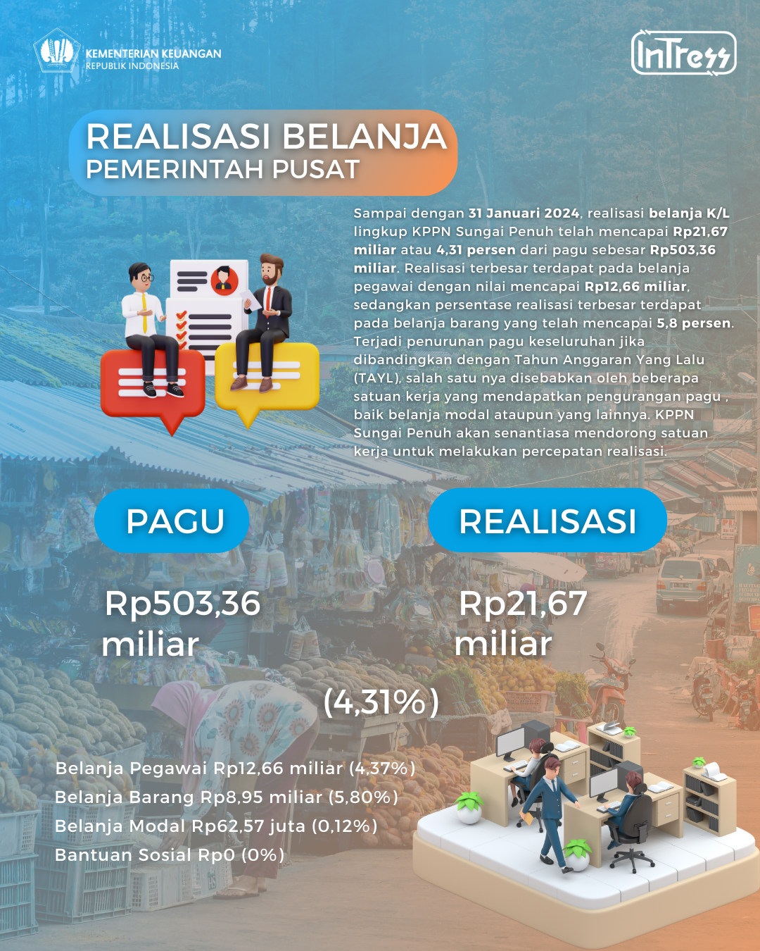 Sampai dengan akhir Juli 2024, KPPN Sungai Penuh telah menyalurkan Rp1,33 triliun atau 58,85 persen dari pagu Rp2,26 triliun.