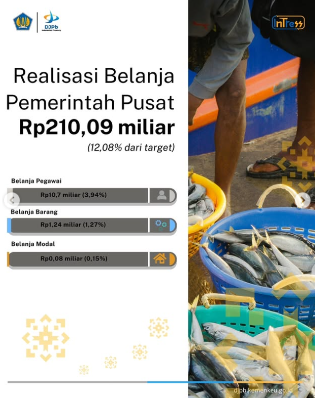 Realisasi belanja negara tercatat sebesar Rp210,09 miliar atau 12,08% dari total pagu anggaran. Realisasi ini mencerminkan pelaksanaan anggaran yang terus berjalan untuk mendukung program pemerintah dan pembangunan di daerah sejak awal tahun anggaran.