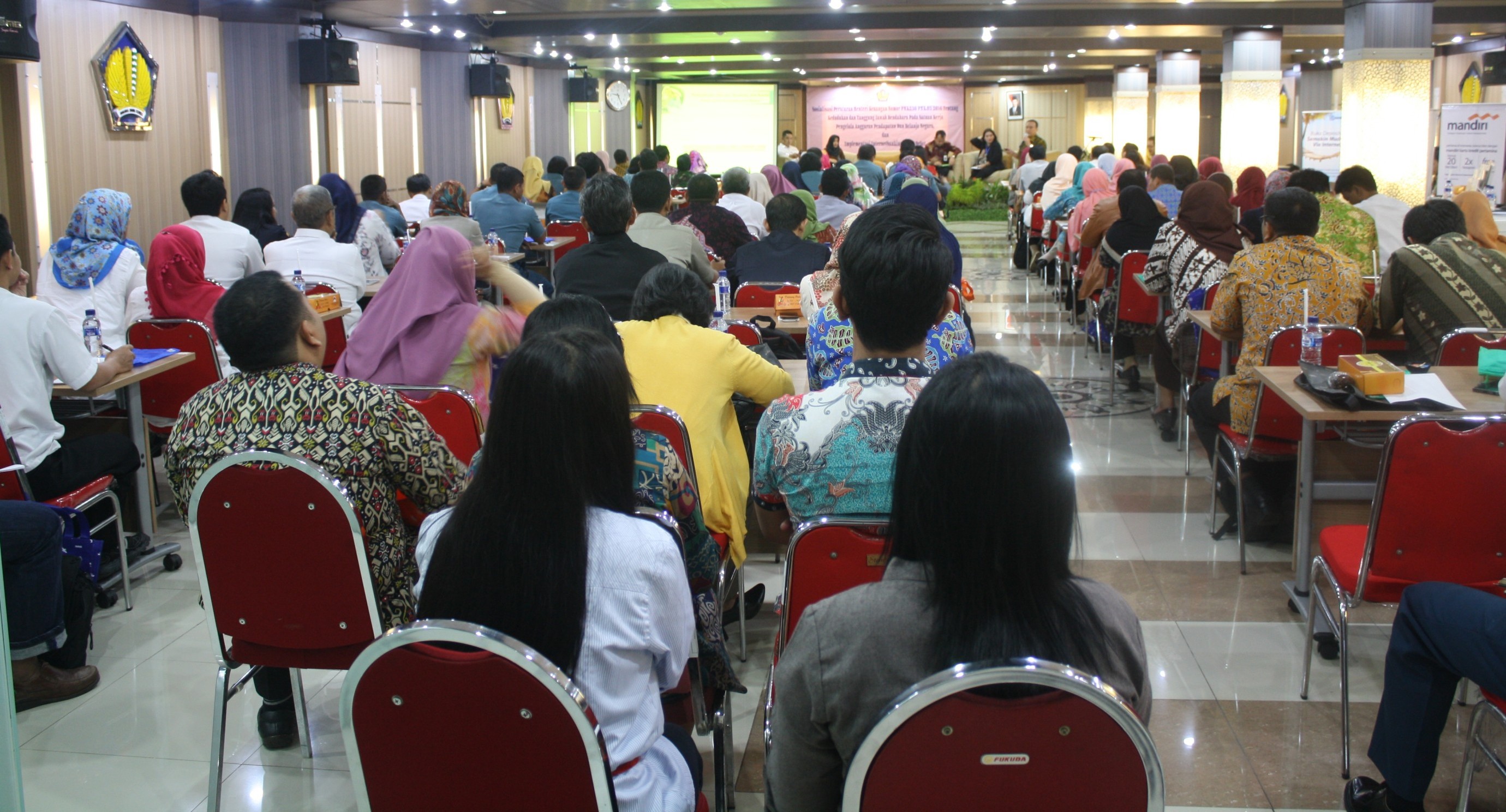 Sebagai pembicara di sesi pertama adalah Bapak M. Agus Lukman Hakim selaku Kepala KPPN Surabaya I. Beberapa hal yang dijelaskan adalah latar belakang dan tujuan penyusunan PMK No. 230/PMK.05/2016, serta substansi yang ada pada peraturan baru tersebut. Hal penting pada PMK baru adalah kedudukan bendahara dalam struktur organisasi suatu instansi pemerintah, syarat pengangkatan bendahara, kewenangan pendebitan rekening, penyediaan internet banking, kartu debit serta konsekuensinya.